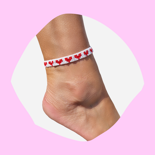 Χειροποίητο Βραχιόλι Ποδιού Λευκό με Κόκκινες Καρδούλες από Χάντρες και Κούμπωμα Μακραμέ