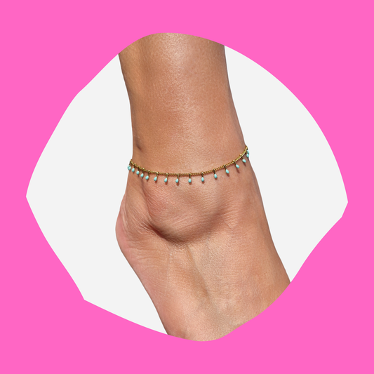 Βραχιόλι Ποδιού από Ατσάλινη Χρυσή Αλυσίδα με Κρεμαστές Τυρκουάζ Σταγόνες