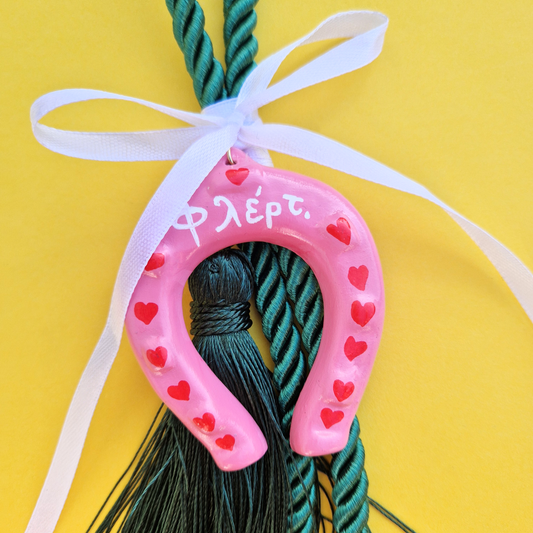 Κρεμαστό Χειροποίητο Κεραμικό Χριστουγεννιάτικο Γούρι 2026 Ροζ Πέταλο με Καρδούλες Φλέρτ