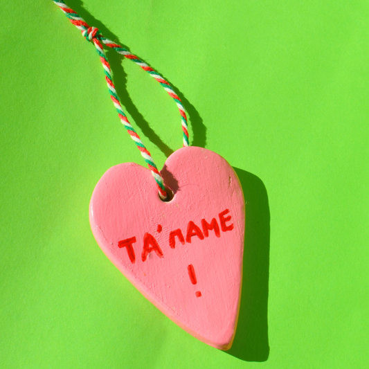 Χειροποίητο Χριστουγεννιάτικο Κεραμικό Στολίδι Ροζ Καρδιά "να τα Πούμε; τα'Παμε"