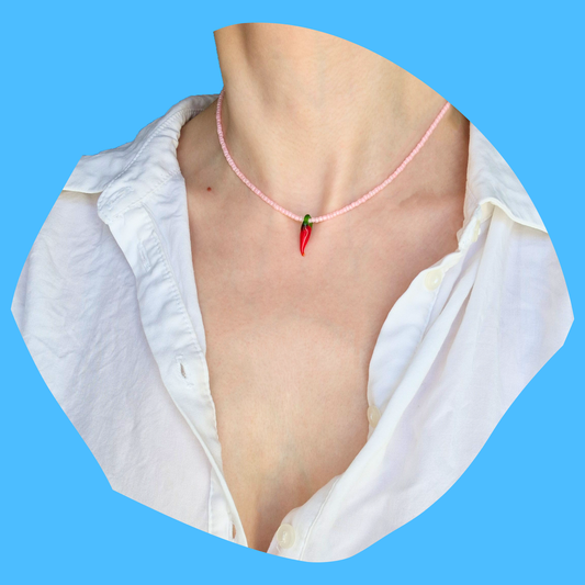 Χειροποίητο Κολιέ από Ροζ Περλέ Χάντρες και Γυάλινη Κόκκινη Πιπεριά