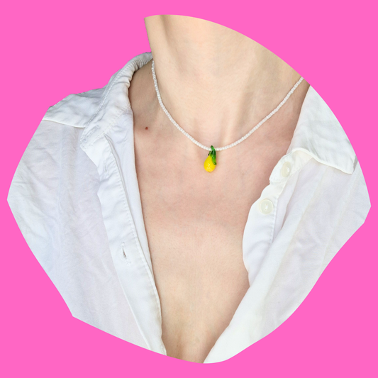 Χειροποίητο Κολιέ από Λευκές Περλέ Χάντρες και Γυάλινο Λεμόνι