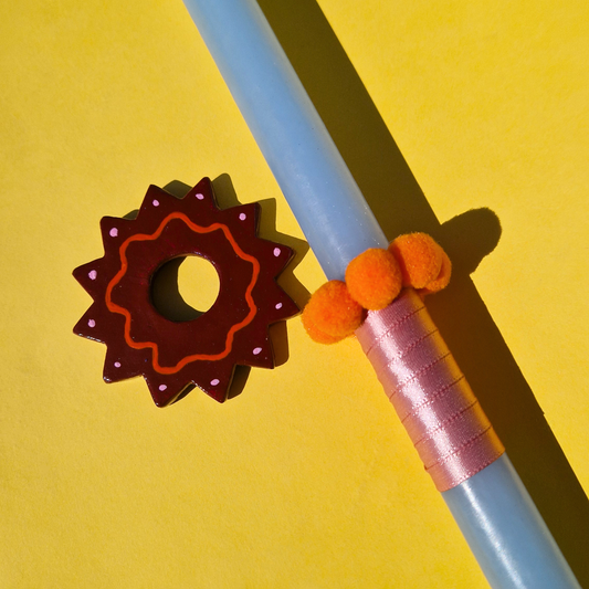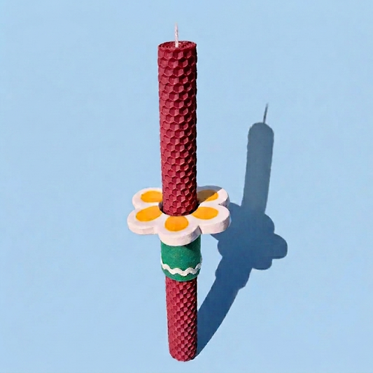 Πασχαλινή Λαμπάδα Χειροποίητη Αρωματική Μπορντό με Κεραμικό Στοιχείο Γαλάζιο-Κόκκινο Λουλούδι
