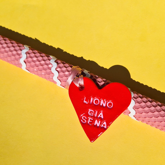 Πασχαλινή Λαμπάδα Χειροποίητη από Μελισσοκέρι Ροζ με Κεραμικό Στοιχείο Κόκκινη Καρδιά Liono Gia Sena (Λιώνω Για Σένα)