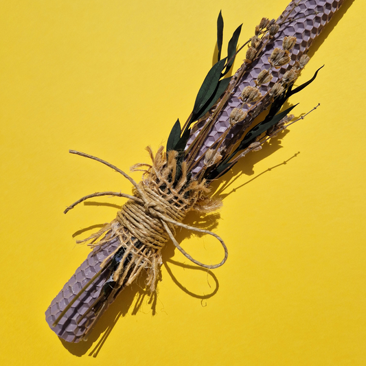 Πασχαλινή Λαμπάδα Χειροποίητη από Μελισσοκέρι Λιλά με Αποξηραμένη Λεβάντα και Πράσινα Φύλλα
