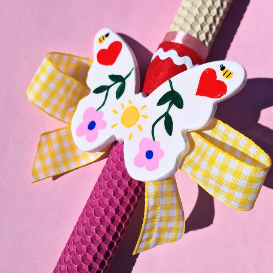 Πασχαλινή Δίχρωμη Λαμπάδα Χειροποίητη από Μελισσοκέρι Μπεζ-Φούξια με Κεραμικό Στοιχείο Πεταλούδα