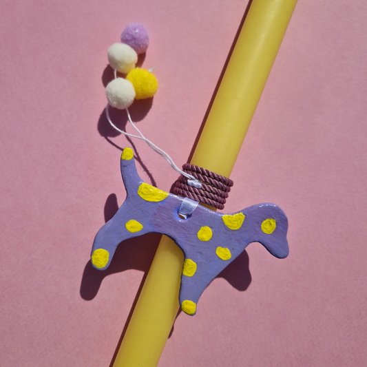 Πασχαλινή Λαμπάδα Χειροποίητη Αρωματική Κίτρινη με Κεραμικό Στοιχείο Λιλά Σκυλάκι Κίτρινο Πουα και Πολύχρωμα Pom Pom