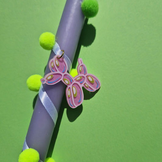 Πασχαλινή Λαμπάδα Χειροποίητη Αρωματική Λιλά με Πλέξι Ακρυλικό Στοιχείο Balloon Dog και Πολύχρωμα Pom Pom
