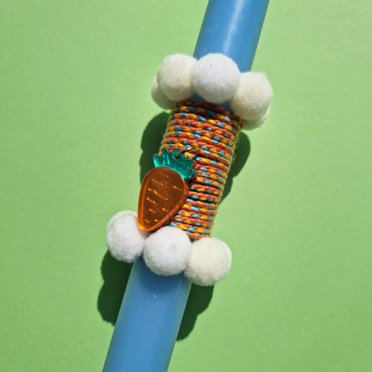 Πασχαλινή Λαμπάδα Χειροποίητη Αρωματική Γαλάζια με Πλέξι Ακρυλικό Στοιχείο Playful Carrot και Λευκά Pom Pom