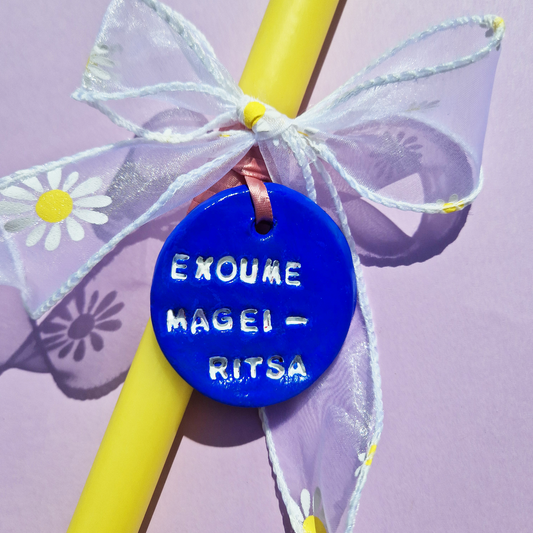 Πασχαλινή Λαμπάδα Χειροποίητη Αρωματική Κίτρινη με Κεραμικό Μπλε Στοιχείο Exoume Mageiritsa (Έχουμε Μαγειρίτσα)