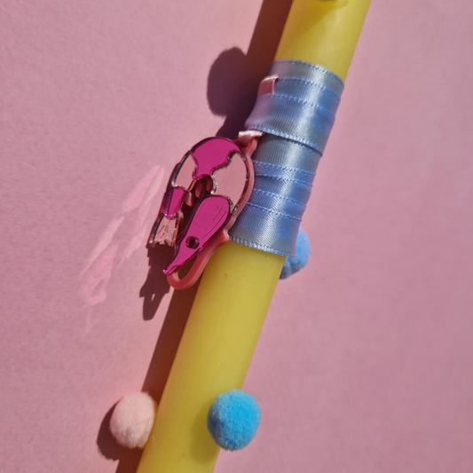 Πασχαλινή Λαμπάδα Χειροποίητη Αρωματική Κίτρινη με Πλέξι Ακρυλικό Στοιχείο Shrimp και Πολύχρωμα Pom Pom