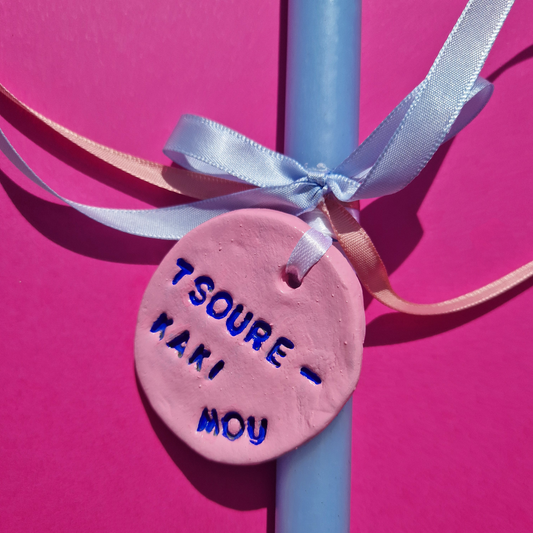 Πασχαλινή Λαμπάδα Χειροποίητη Αρωματική Γαλάζια με Κεραμικό Ροζ Στοιχείο Tsourekaki Mou (Τσουρεκάκι μου)