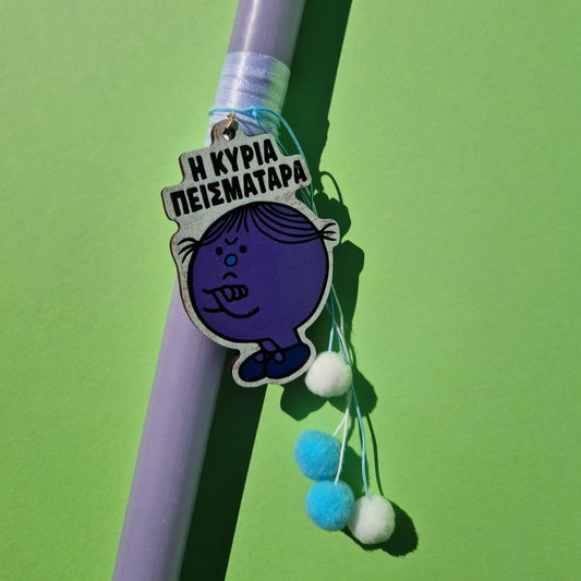 Πασχαλινή Λαμπάδα Χειροποίητη Αρωματική Λιλά με Ξύλινο Στοιχείο η Κυρία Πεισματάρα