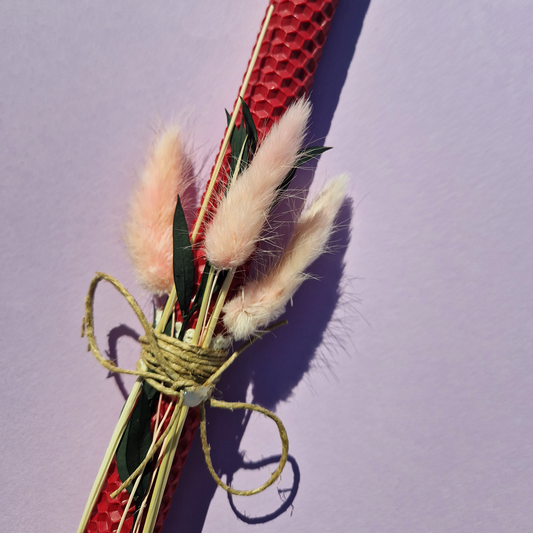Πασχαλινή Λαμπάδα Χειροποίητη από Μελισσοκέρι Μπορντό με Αποξηραμένo Γατάκι/Lagurus και Πράσινα Φύλλα