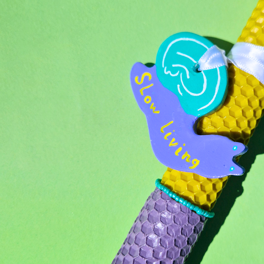 Πασχαλινή Δίχρωμη Λαμπάδα Χειροποίητη από Μελισσοκέρι Κίτρινη-Λιλά με Κεραμικό Στοιχείο Σαλιγκάρι Slow Living