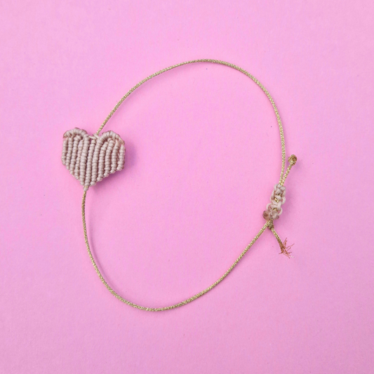 Χειροποίητο Μακραμέ Βραχιόλι με Διαγώνια Μπεζ Καρδιά και Χρυσή Κλωστή