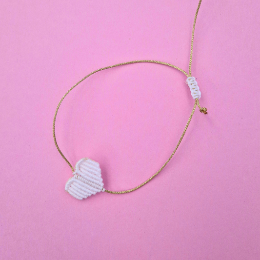 Χειροποίητο Μακραμέ Βραχιόλι με Διαγώνια Λευκή Καρδιά και Χρυσή Κλωστή