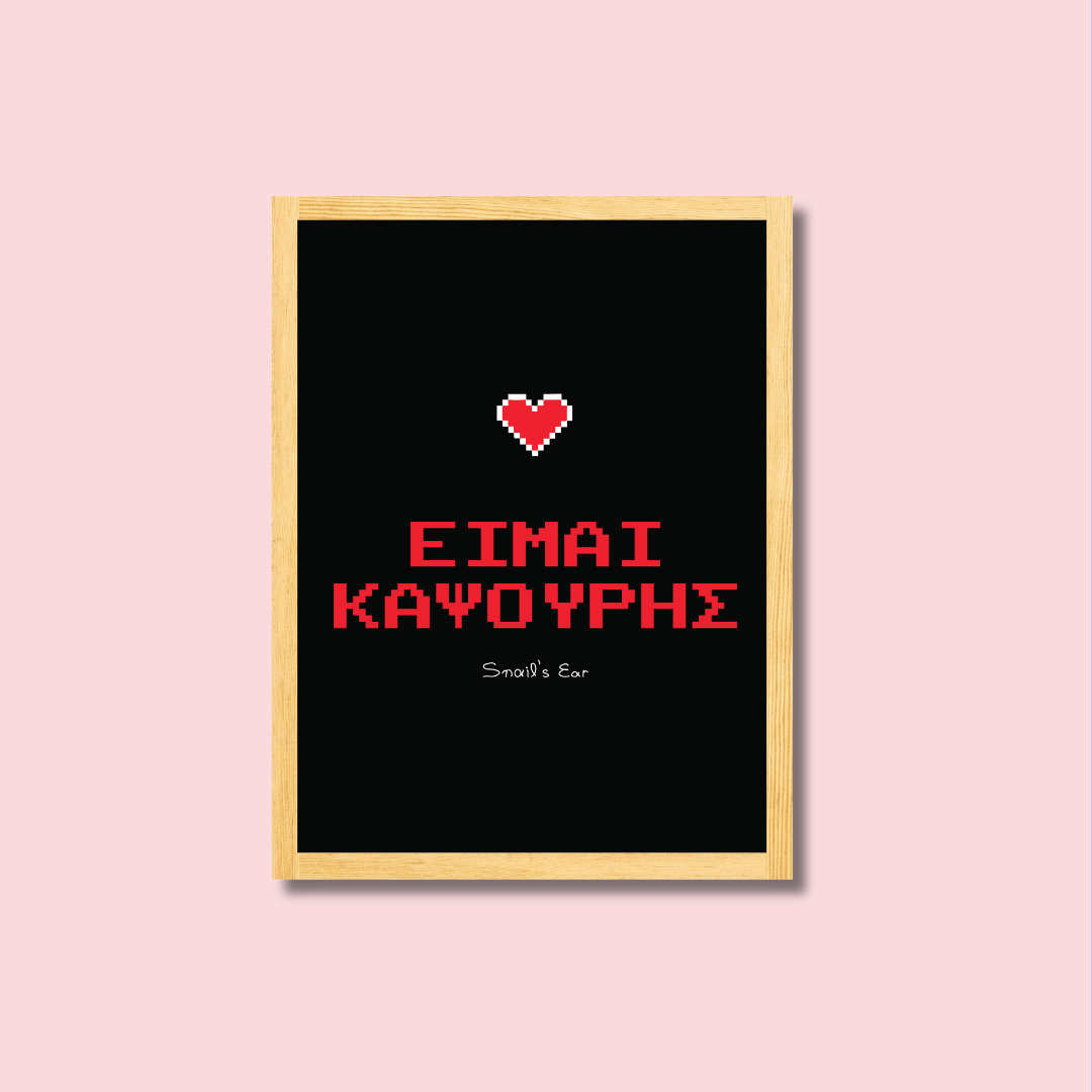 Δώσε ένταση στο συναίσθημα με το μαύρο poster "Είμαι Καψούρης" – με κόκκινη καρδούλα και κόκκινα γράμματα, ιδανικό για δώρο σε αγαπημένο πρόσωπο ή για μοναδική διακόσμηση στο σπίτι. Ένα ξεχωριστό poster που μιλάει στην καρδιά. Τέλειο για τους ρομαντικούς και παθιασμένους!