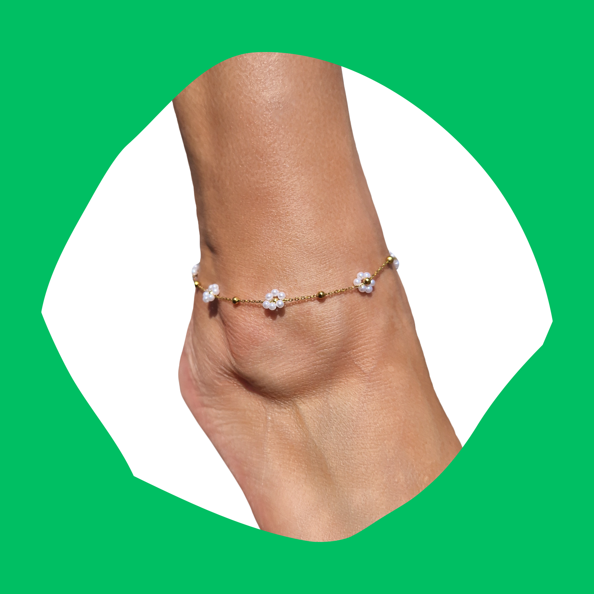 Χάρισε ρομαντισμό και κομψότητα στις καλοκαιρινές σου εμφανίσεις με το Βραχιόλι Ποδιού από Ατσάλινη Χρυσή Αλυσίδα με Λουλούδια από Πέρλες! Υποαλλεργικό, δεν μαυρίζει και προσθέτει διακριτική λάμψη σε κάθε βήμα. Ιδανικό για παραλία, νησί και καλοκαιρινές βόλτες με στυλ και φινέτσα.