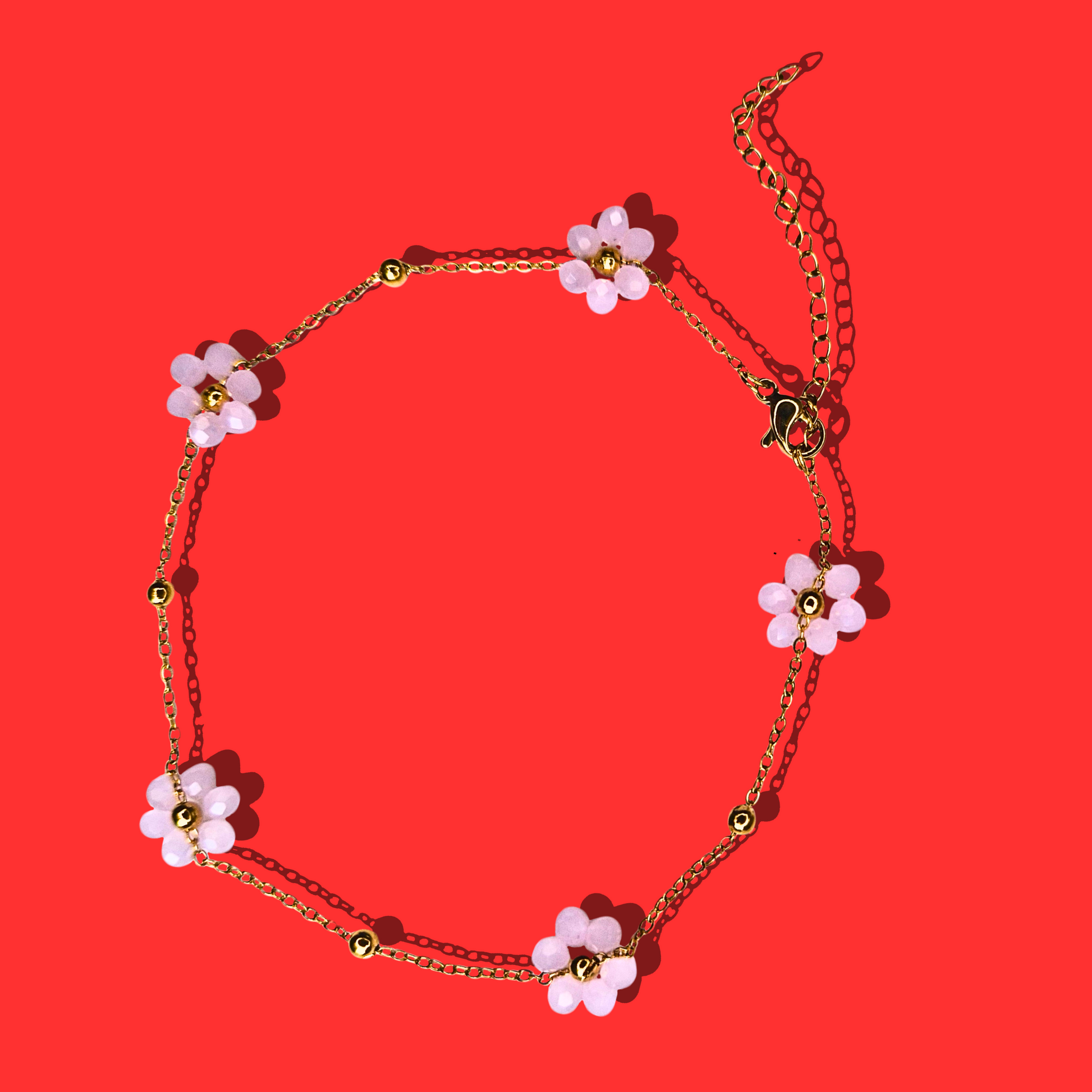 Βραχιόλι Ποδιού από Ατσάλινη Χρυσή Αλυσίδα με Ροζ Γυάλινες Λουλούδια
