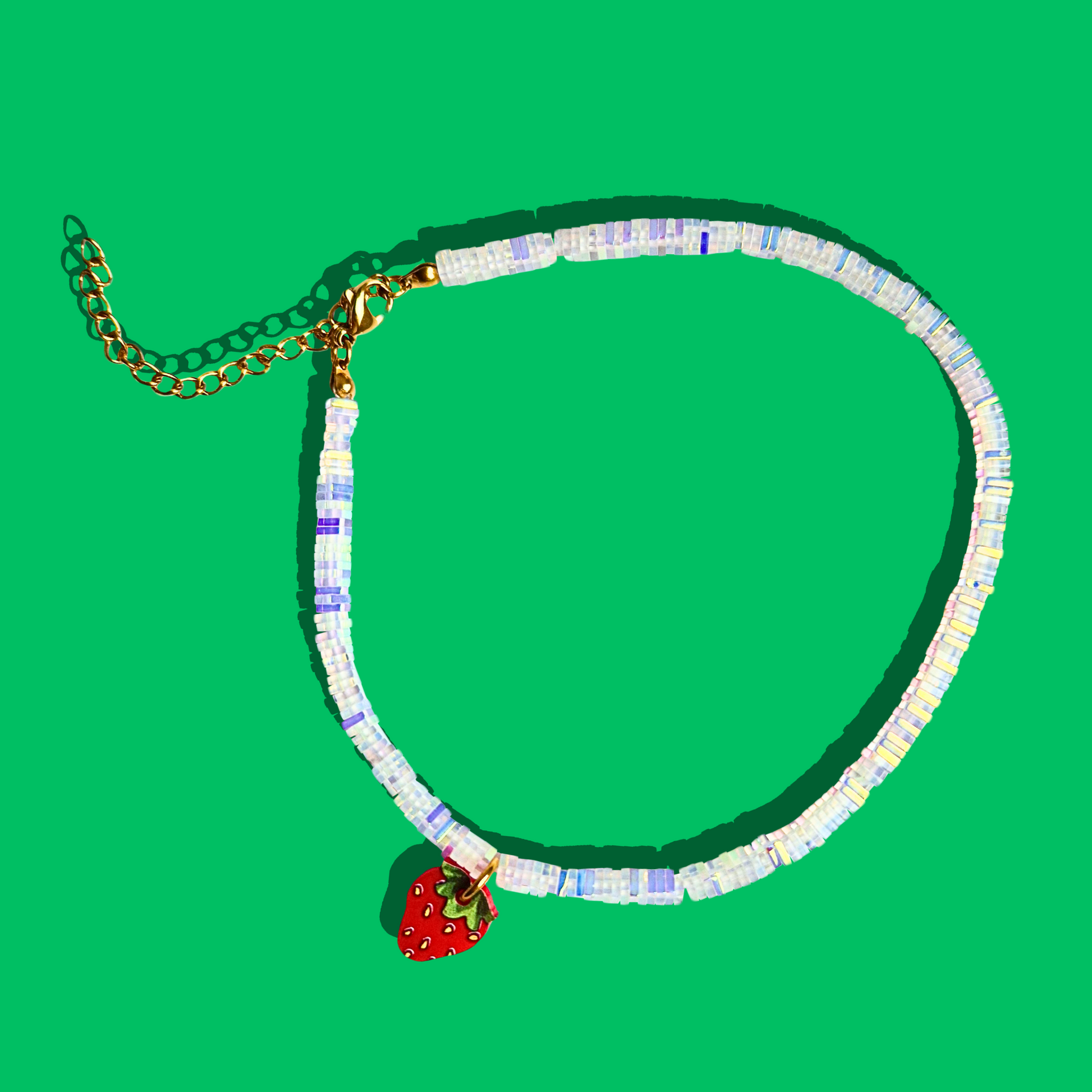 Βραχιόλι Ποδιού από Λευκά Κρυσταλλάκια και Κρεμαστή Πλέξι Φραουλίτσα