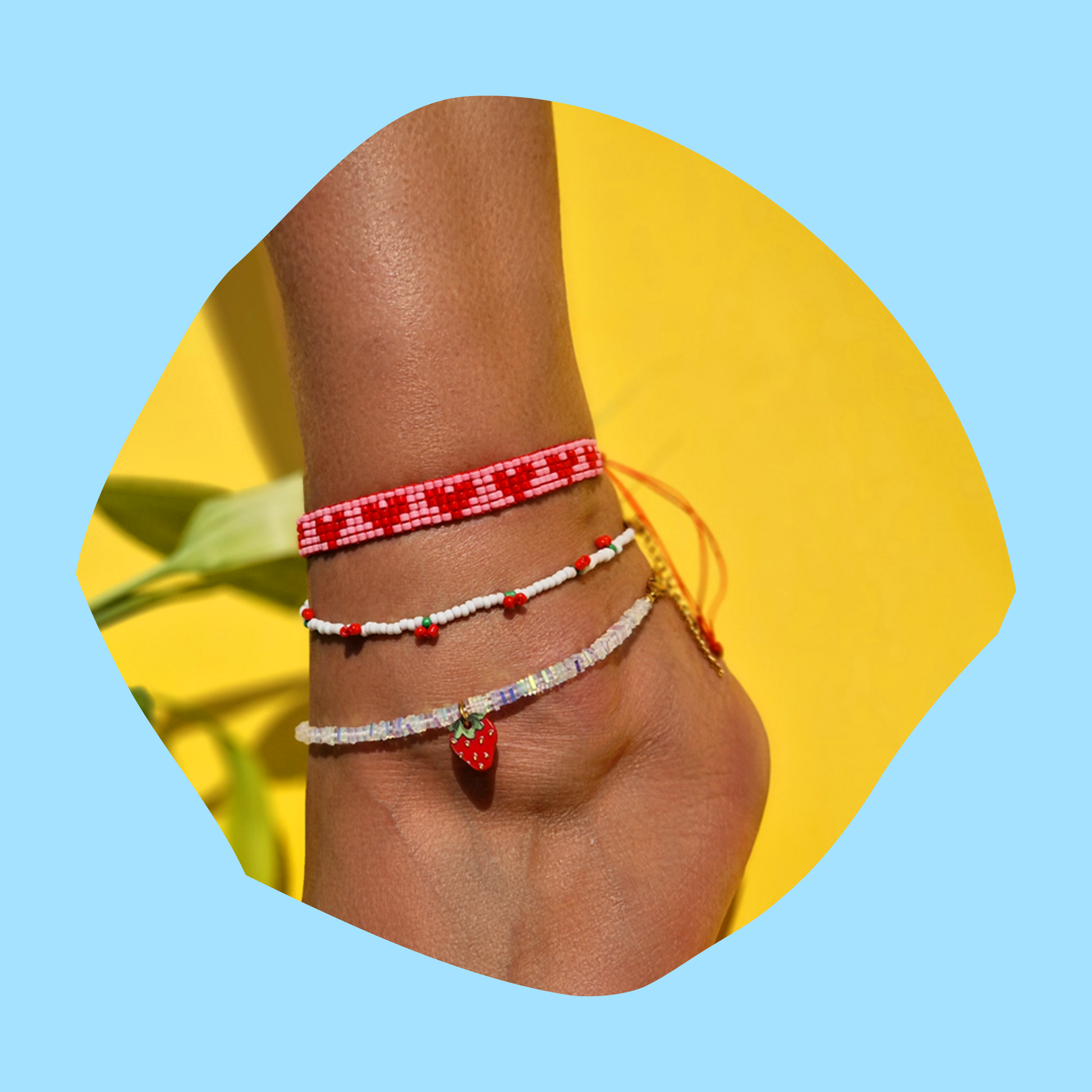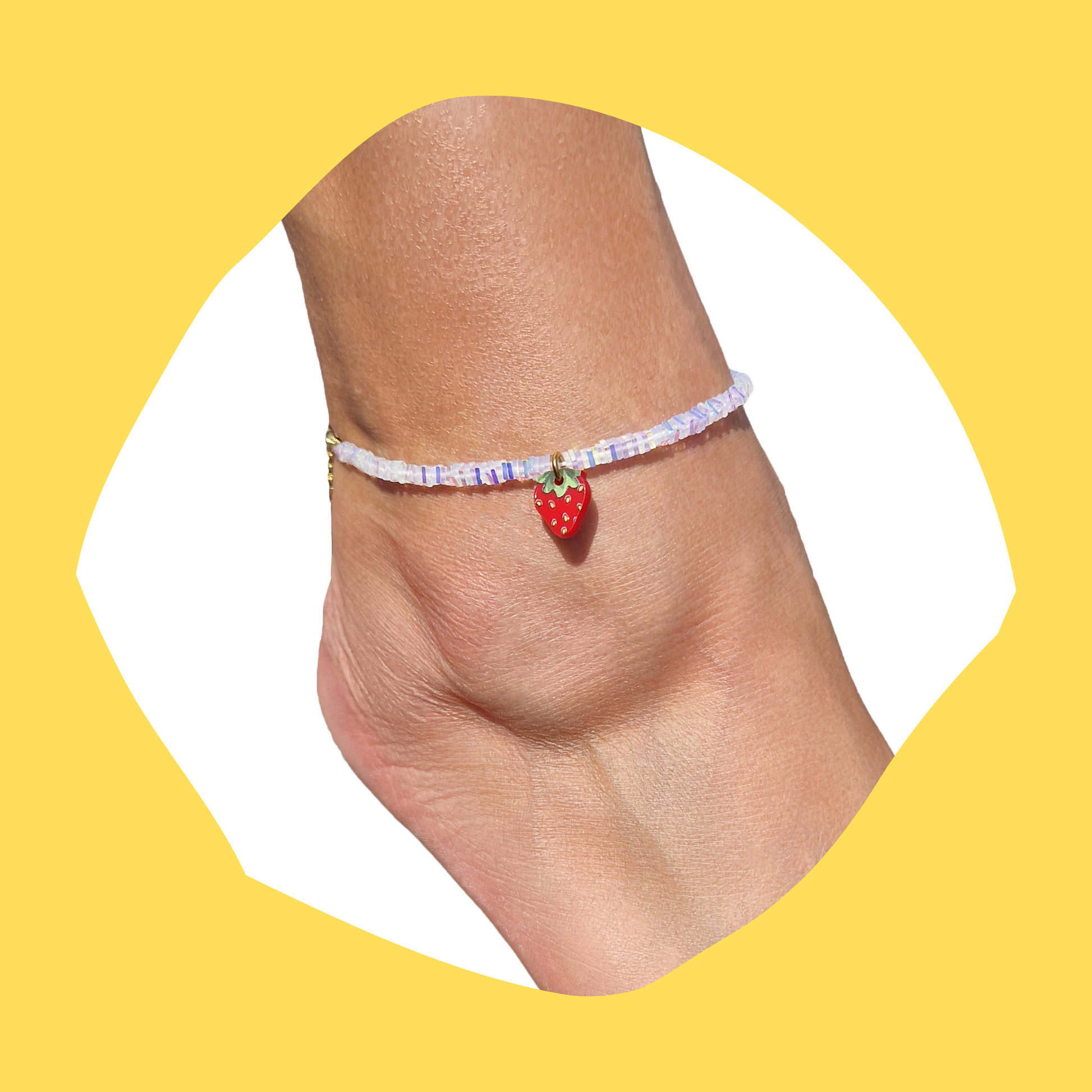 Βραχιόλι ποδιού με λευκά κρυσταλλάκια και κρεμαστή πλέξι φραουλίτσα, που αποπνέει καλοκαιρινή φρεσκάδα και στυλ. Η εντυπωσιακή του λάμψη στον ήλιο και η παιχνιδιάρικη φραουλίτσα το κάνουν ακαταμάχητο. Με υποαλλεργικό, ατσάλινο κούμπωμα που δεν μαυρίζει, είναι το απόλυτο αξεσουάρ για κάθε καλοκαιρινή εμφάνιση.