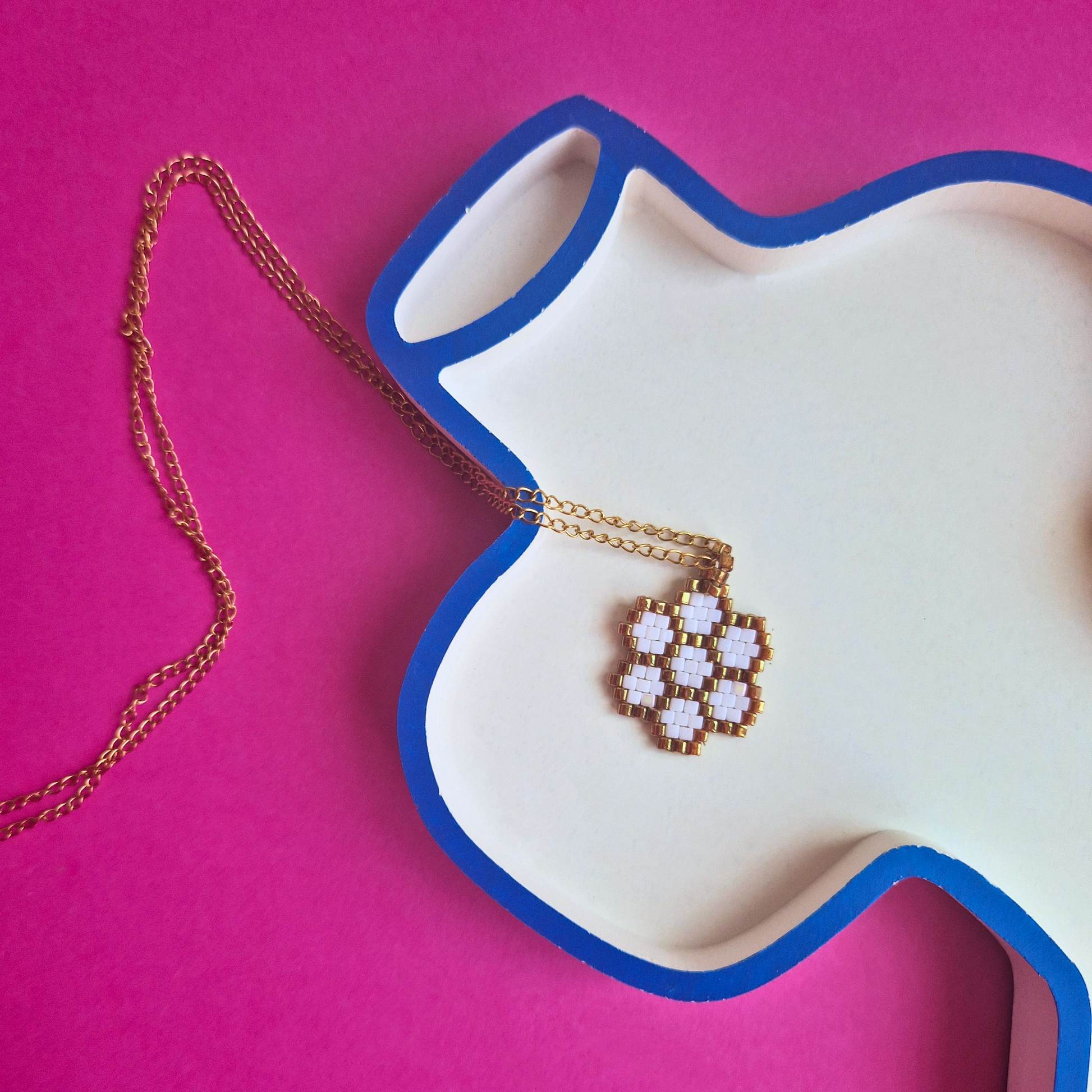 Ανακαλύψτε το κομψό χειροποίητο κολιέ με λευκό χρυσό λουλούδι από χάντρες Miyuki. Μπορείτε να επιλέξετε αν το θέλετε με ατσάλινη χρυσή αλυσίδα ή σε πετονιά. Το εκλεπτυσμένο σχέδιο αποπνέει φρεσκάδα και θηλυκότητα, ιδανικό για δώρο.