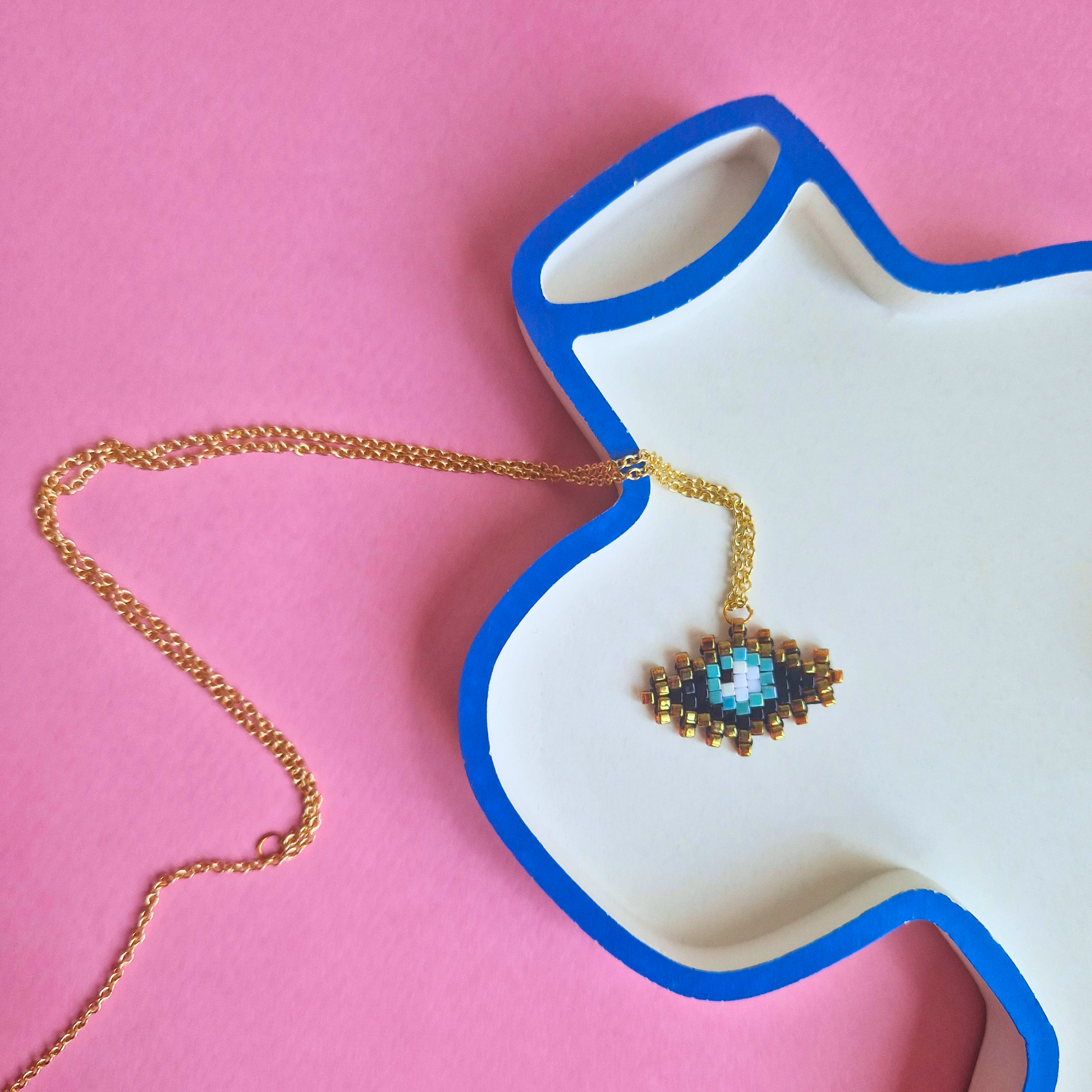 Ανακαλύψτε την ιδιαίτερη γοητεία του χειροποίητου κολιέ με μαύρο μάτι από χάντρες Miyuki, κρεμασμένο σε ατσάλινη χρυσή αλυσίδα ή πετονιά για ένα εκλεπτυσμένο αποτέλεσμα. Το μαύρο μάτι, σύμβολο προστασίας, συνδυάζεται με τη λάμψη του χρυσού, δημιουργώντας ένα μοναδικό κόσμημα. Επιλέξτε το γράμμα της προτίμησής σας και το φτιάχνουμε κατόπιν παραγγελίας για εσάς!