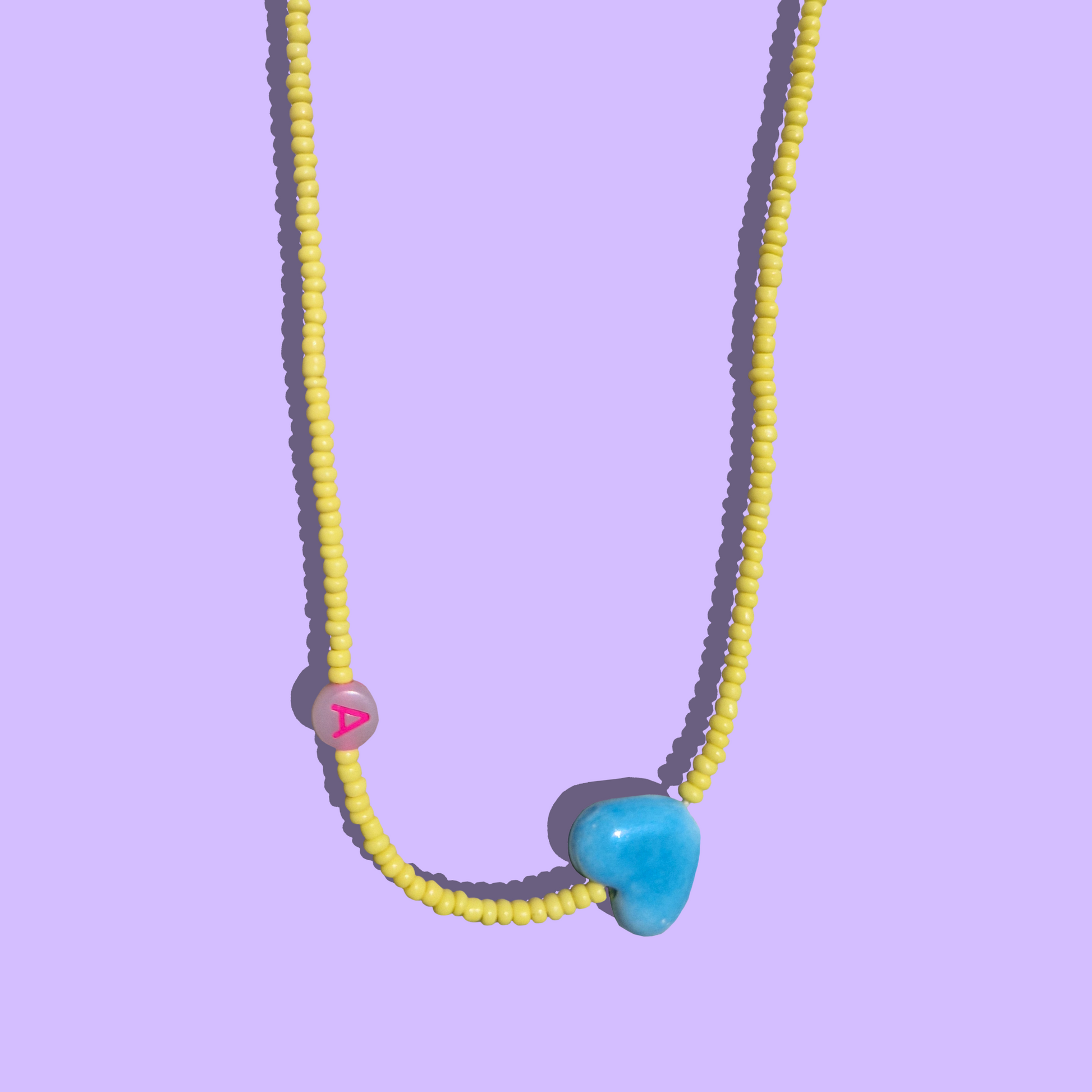 Το Custom Χειροποίητο Κολιέ με κίτρινες χάντρες, κεραμική γαλάζια καρδιά και φωσφοριζέ χάντρα με μονόγραμμα είναι το απόλυτο καλοκαιρινό αξεσουάρ. Επιλέξτε το γράμμα που θέλετε και το δημιουργούμε αποκλειστικά για εσάς. Οι χάντρες με τα γράμματα φωσφορίζουν στο σκοτάδι, προσθέτοντας μαγεία και προσωπικότητα στο στυλ σας.
