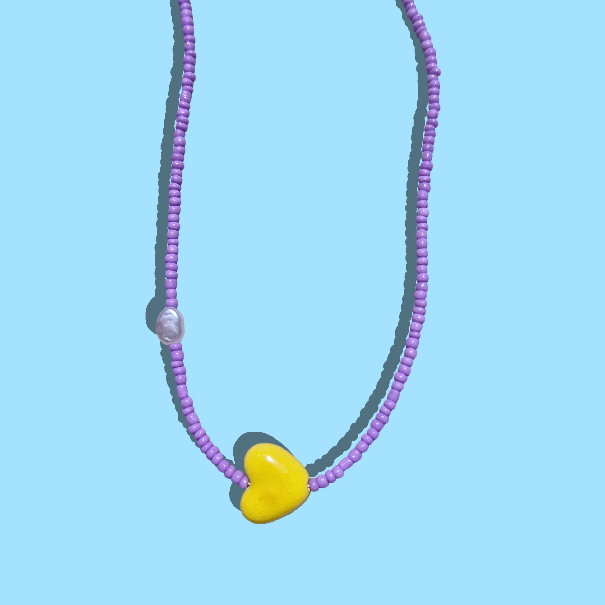 Custom Χειροποίητο Κολιέ από Λιλά Χάντρες, Κεραμική Κίτρινη Καρδιά και Απομίμηση Μαργαριταριού