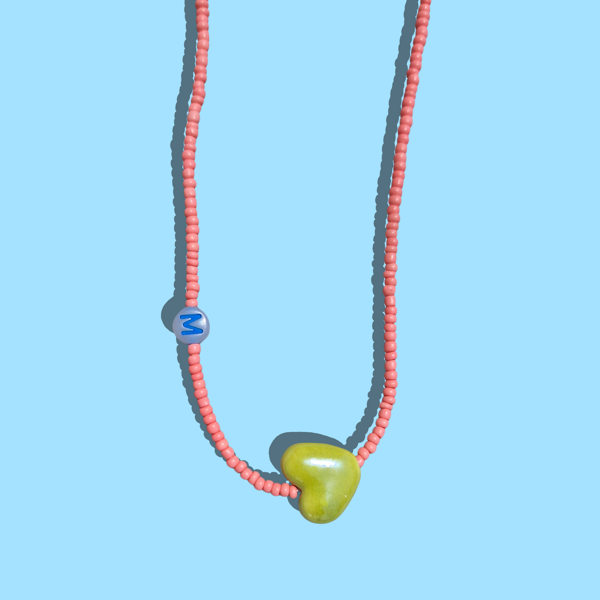 Custom Χειροποίητο Κολιέ από Σομόν Χάντρες, Κεραμική Λαχανί Καρδιά και Φωσφοριζέ Χάντρα με Μονόγραμμα