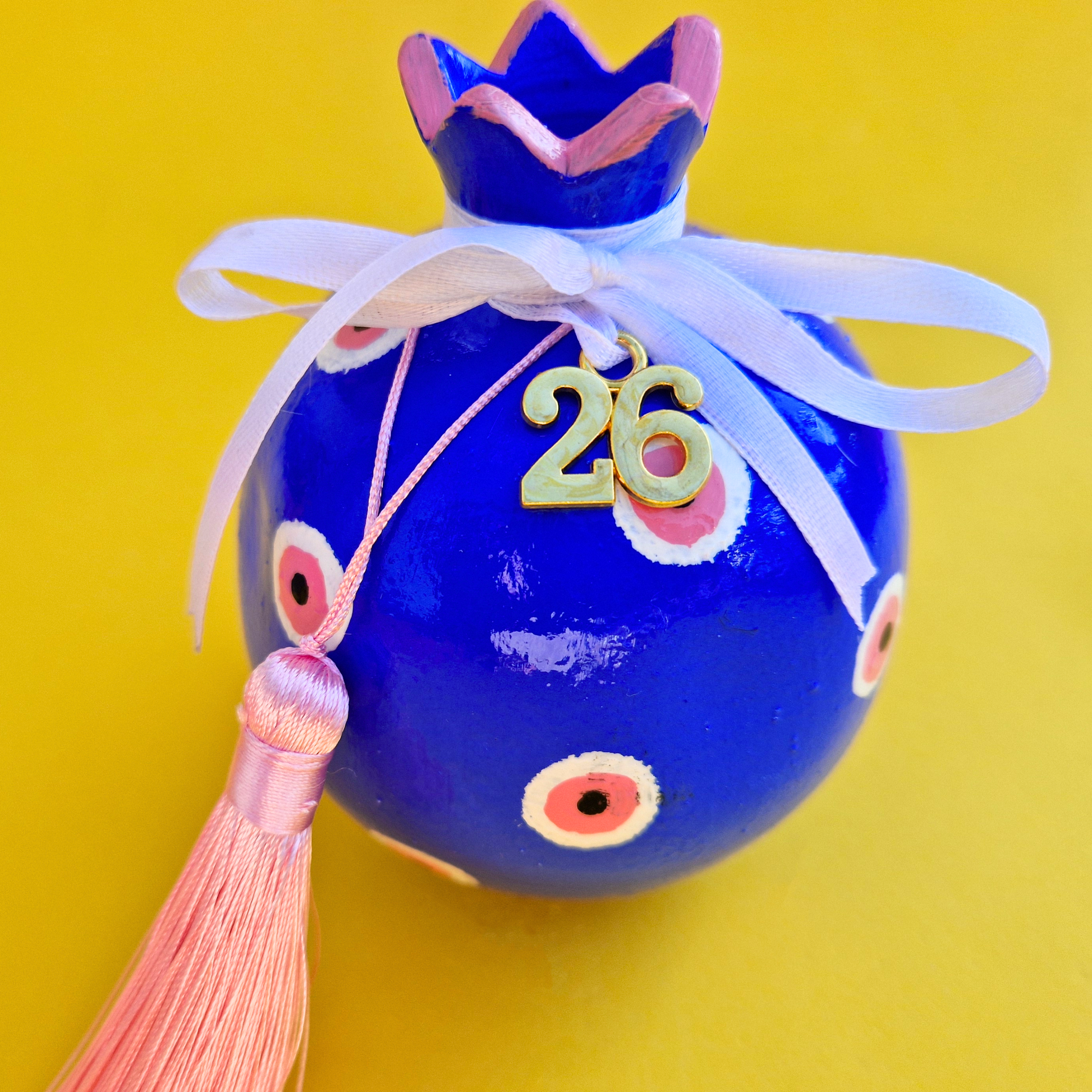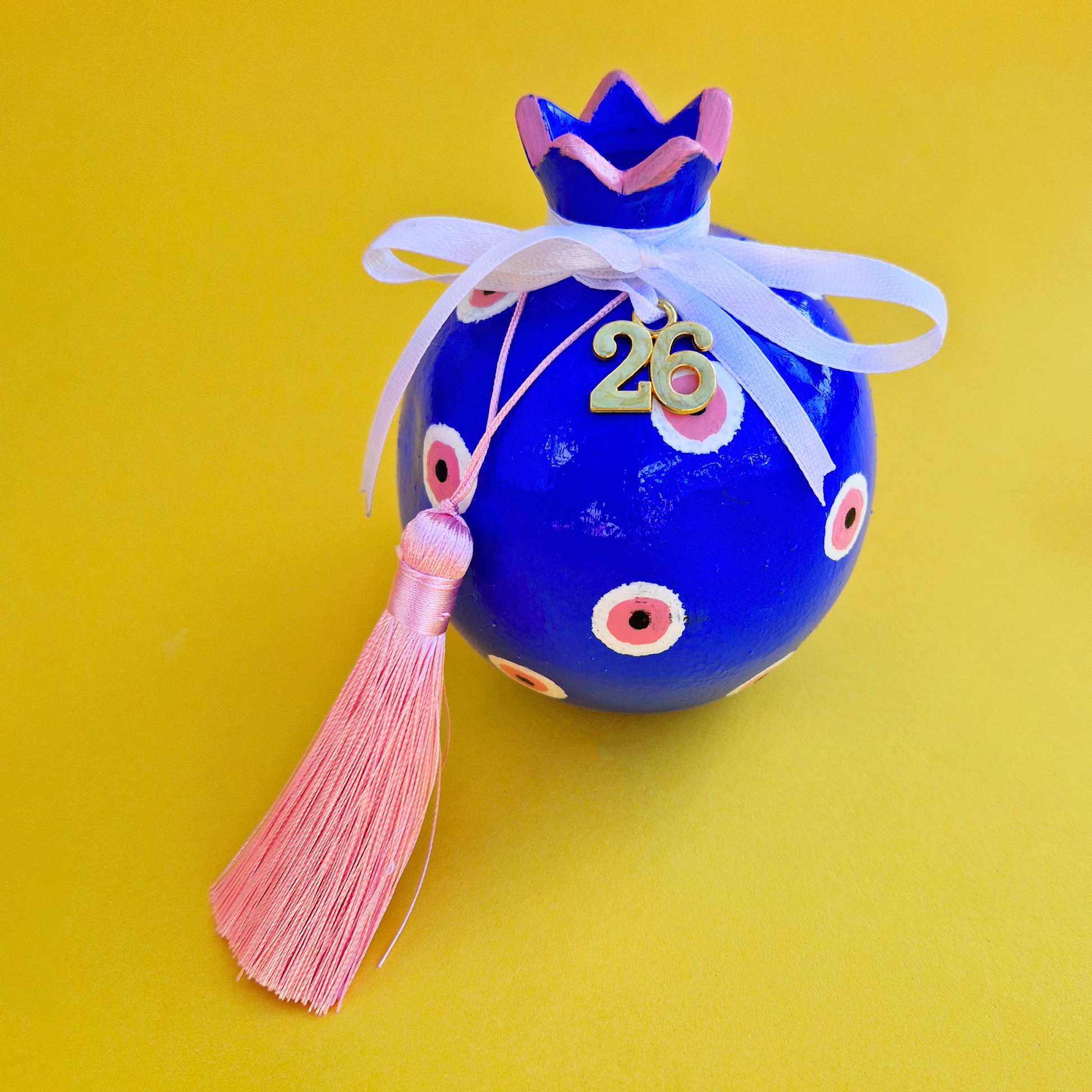 Το Επιτραπέζιο Χειροποίητο Κεραμικό Χριστουγεννιάτικο Γούρι 2026 Μπλε Ρόδι με Ματάκια, Φούντα και Φιογκάκι είναι ένα μοναδικό γούρι ζωγραφισμένο στο χέρι, γεμάτο χρώμα και συμβολισμό. Το ρόδι φέρνει τύχη, ευτυχία και αφθονία για τη νέα χρονιά, ενώ τα ροζ ματάκια προστατεύουν από την αρνητική ενέργεια. Με ροζ φούντα, λευκό φιογκάκι και μεταλλικό στοιχείο 26, είναι το ιδανικό χειροποίητο δώρο ή διακοσμητικό για κάθε σπίτι.