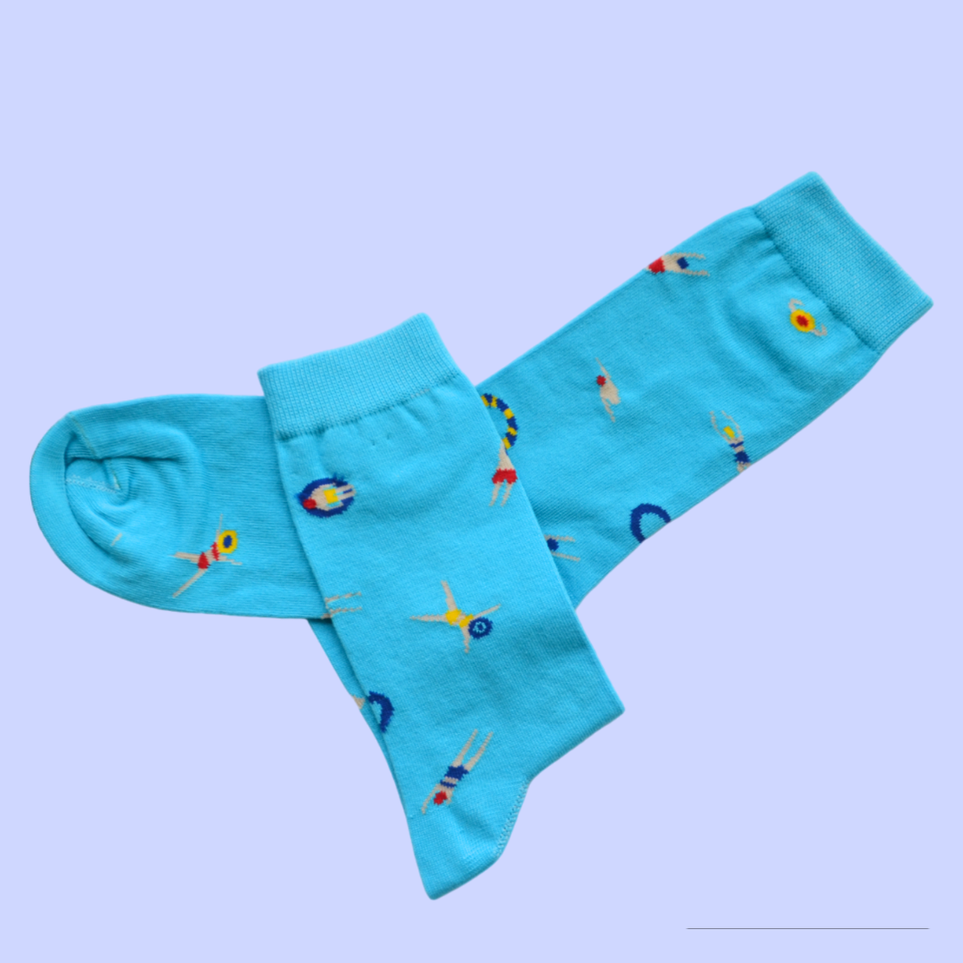 Οι Γαλάζιες Κάλτσες με Κολυμβητές φέρνουν καλοκαιρινή δροσιά και παιχνιδιάρικη διάθεση σε κάθε σου βήμα! Άνετες, ποιοτικές και με μοναδικό design, είναι ιδανικές για όσους αγαπούν το στιλ με χιούμορ. Φόρεσέ τες και νιώσε κάθε μέρα σαν βουτιά σε κάτι όμορφο!