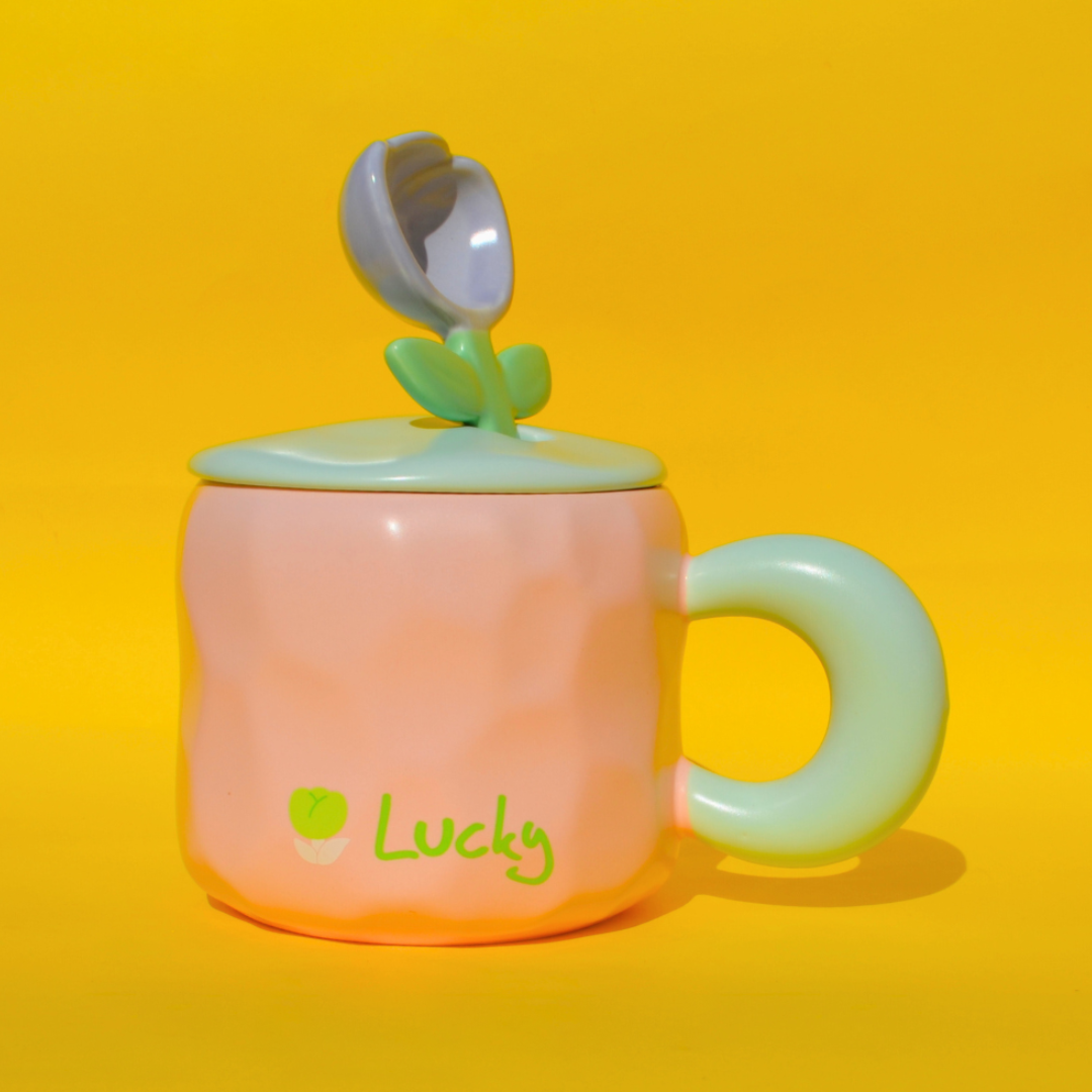 Η κεραμική ροζ κούπα με γαλάζιο καπάκι, λιλά κουταλάκι σε σχήμα τουλίπας και χοντρή γαλάζια λαβή είναι ένας ύμνος στη χαρά της καθημερινότητας. Ιδανική για δώρο ή για να ομορφύνεις τη δική σου στιγμή καφέ. Κούπα κεραμική, ροζ κούπα, λουλουδένιο κουτάλι, μοναδικό στυλ.