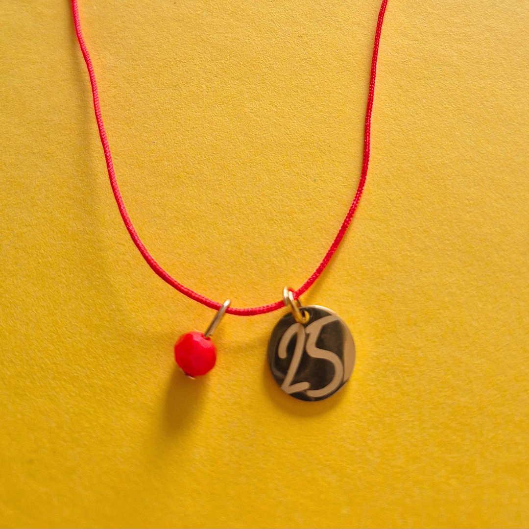 Αναδείξτε το προσωπικό σας στυλ με το χειροποίητο κολιέ από κόκκινο κορδόνι και ατσάλινο στοιχείο "25" με λαμπερό κρυσταλλάκι. Το μακραμέ κούμπωμα προσφέρει άνεση και σταθερότητα. Υποαλλεργικό και ανθεκτικό στοιχείο, δεν μαυρίζει. Ένα ξεχωριστό κόσμημα με συμβολισμό και συναισθηματική αξία για κάθε περίσταση.