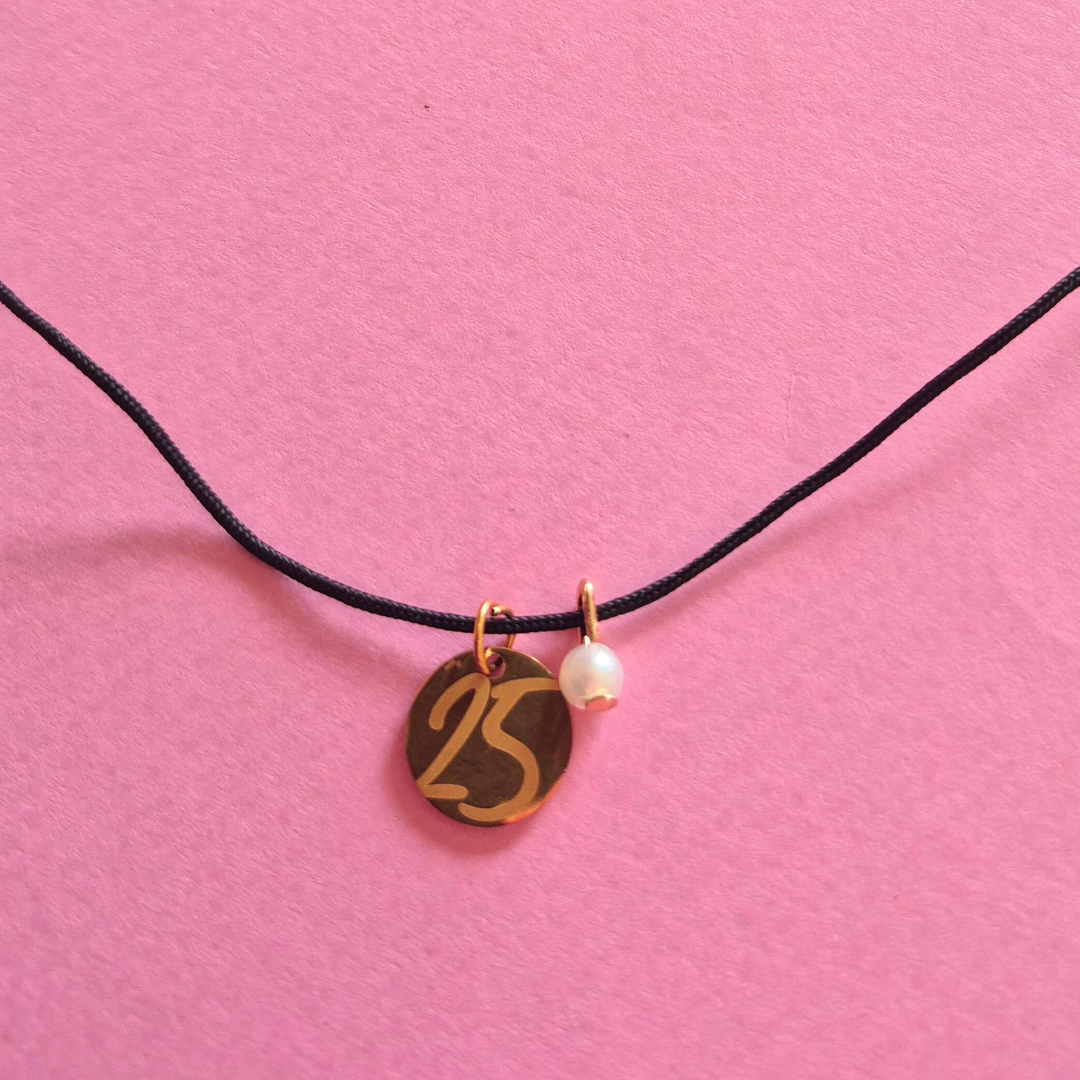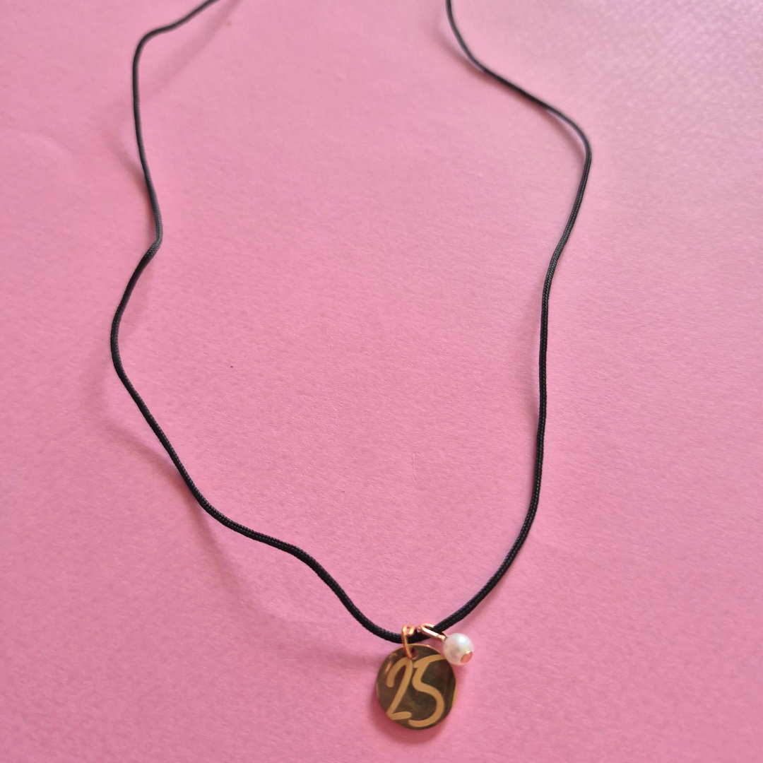 Αναδείξτε το στυλ σας με το χειροποίητο κολιέ από μαύρο κορδόνι και ατσάλινο στοιχείο “25” με κομψή πέρλα. Με μακραμέ κούμπωμα για τέλεια εφαρμογή, είναι υποαλλεργικό και δεν μαυρίζει. Ένα κόσμημα με συμβολισμό και αισθητική, ιδανικό για να ξεχωρίσετε με διακριτική φινέτσα.