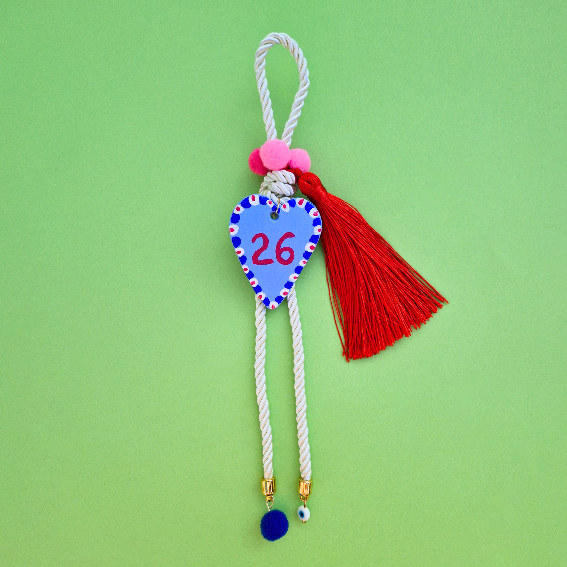 Το Κρεμαστό Χειροποίητο Κεραμικό Χριστουγεννιάτικο Γούρι 2026 Γαλάζια Καρδιά είναι ένα μοναδικό, ζωγραφισμένο στο χέρι γούρι, με γαλάζια καρδιά που γράφει με φούξια γράμματα το 26. Διαθέτει λευκό κορδόνι, κόκκινη φούντα, πομ πομ και ματάκι, φέρνοντας τύχη, αγάπη και θετική ενέργεια στο σπίτι σας τη νέα χρονιά.