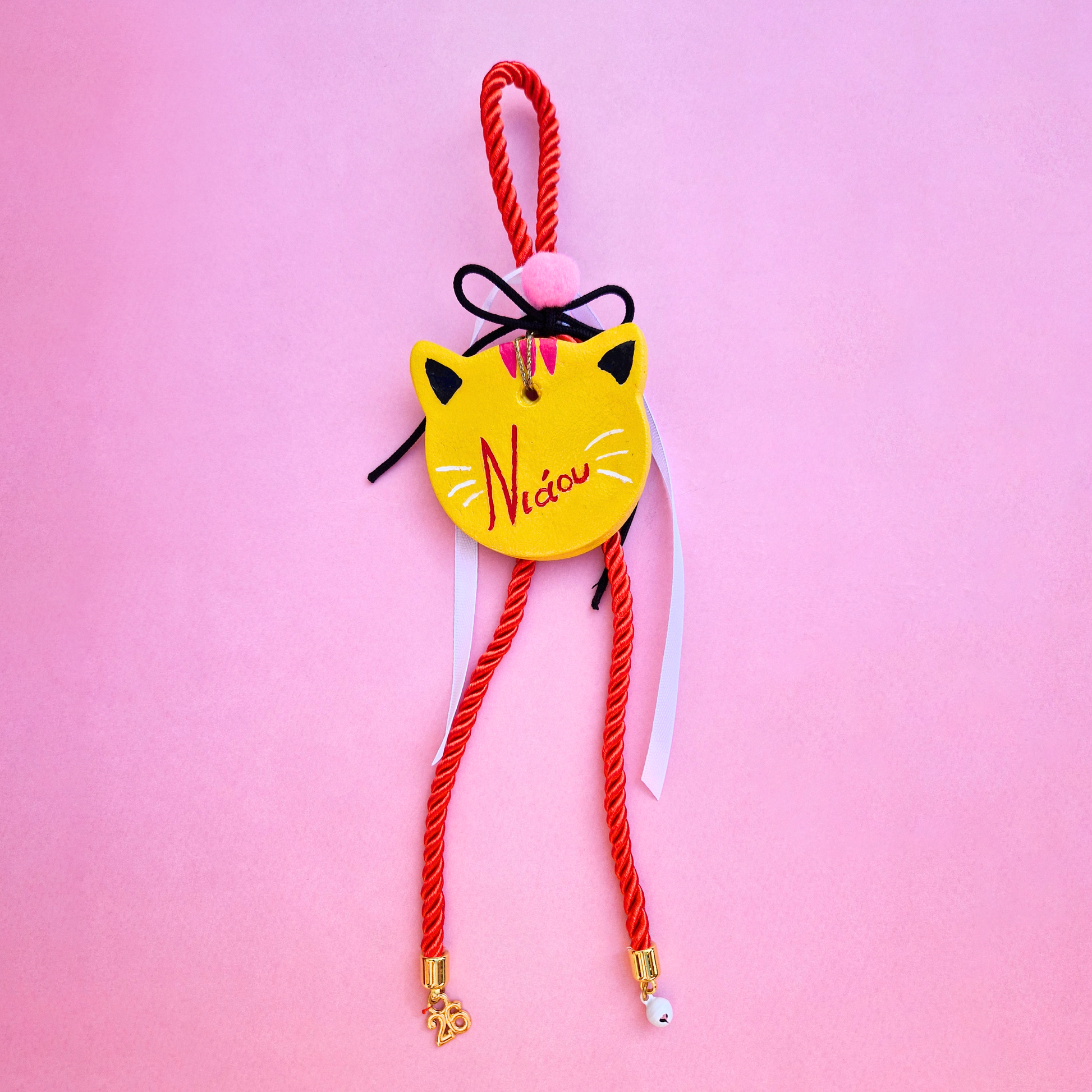 Κρεμαστό Χειροποίητο Κεραμικό Χριστουγεννιάτικο Γούρι 2026 Κίτρινη Γατούλα Νιάου