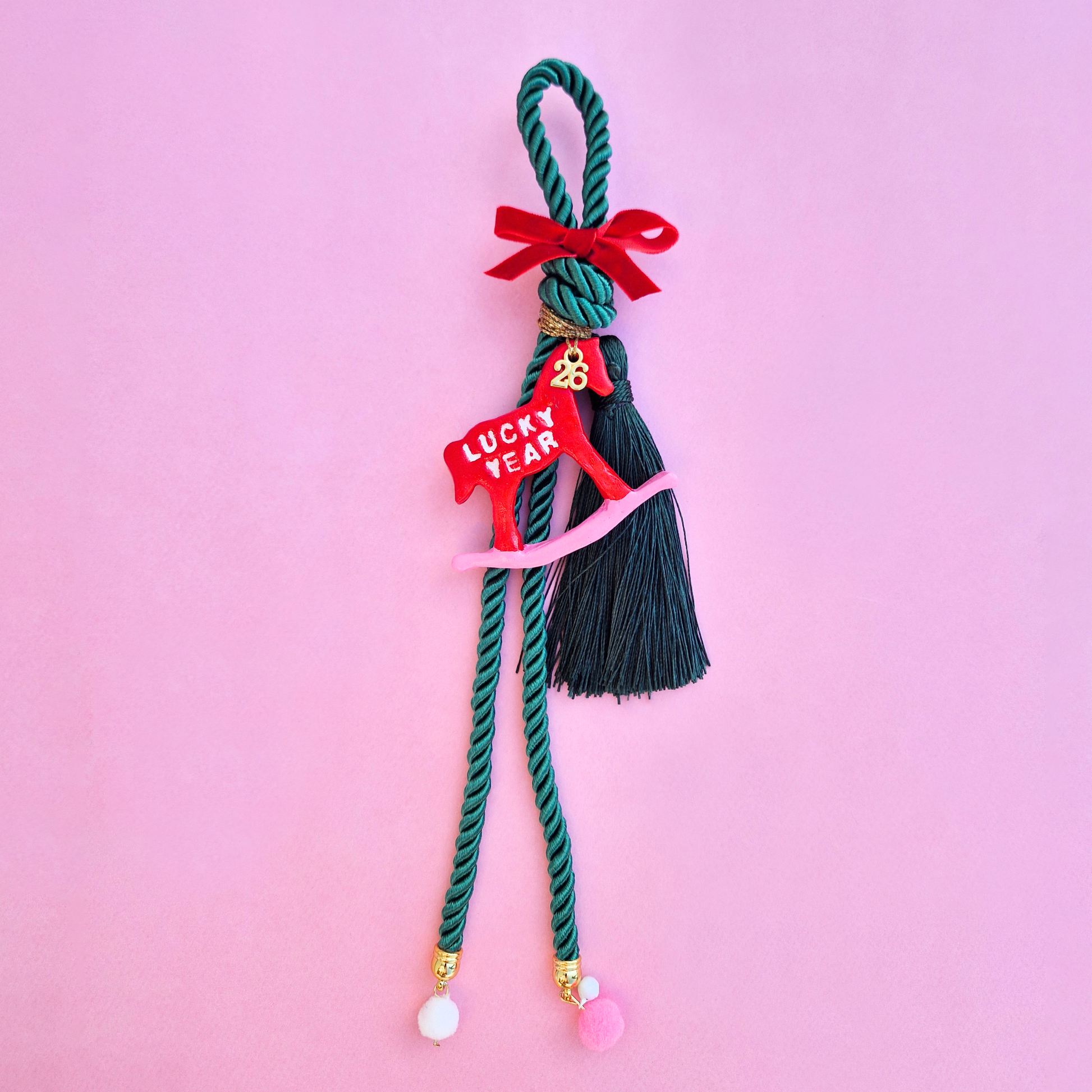 Το Κρεμαστό Χειροποίητο Κεραμικό Χριστουγεννιάτικο Γούρι 2026 Κόκκινο Αλογάκι Lucky Year είναι ζωγραφισμένο στο χέρι και εμπνευσμένο από το γεγονός ότι το 2026 είναι η χρονιά του αλόγου. Με κυπαρισσί κορδόνι, κόκκινο φιόγκο και ροζ-λευκά πομ πομ, συμβολίζει τη δύναμη, την τύχη και τη χαρά για τη νέα χρονιά.