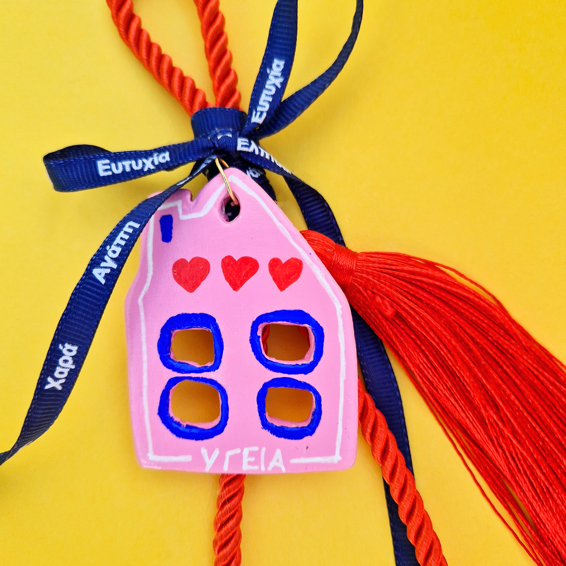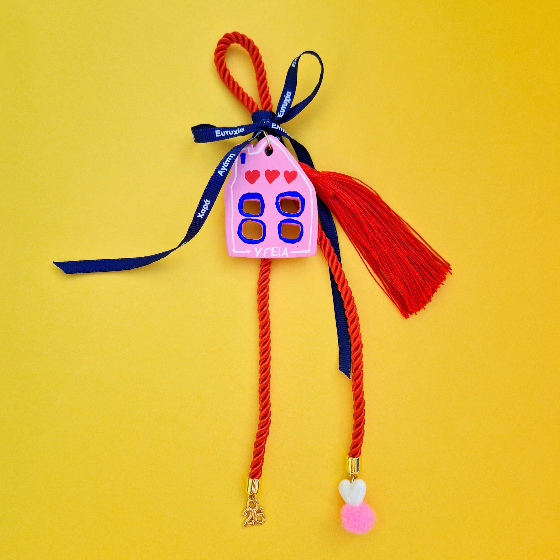 Κρεμαστό Χειροποίητο Κεραμικό Χριστουγεννιάτικο Γούρι 2026 Ροζ Σπιτάκι με Καρδούλες Υγεία
