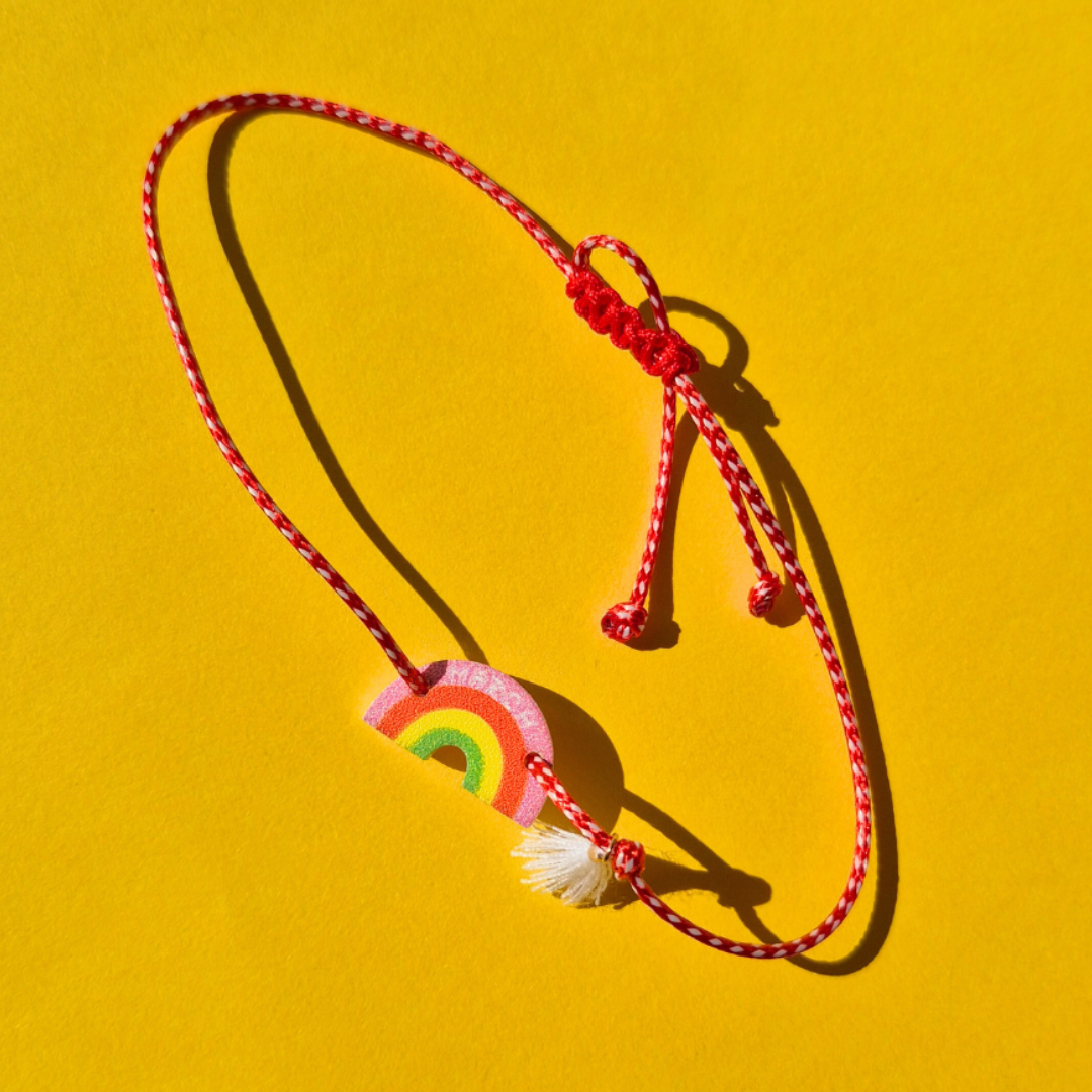Φέρτε όλα τα χρώματα της άνοιξης στον καρπό σας με αυτό το χειροποίητο Μαρτάκι! Με χαρούμενο πλέξι ακρυλικό ουράνιο τόξο, λευκό φουντάκι και ανθεκτικό μακραμέ κούμπωμα, αποτελεί το πιο φωτεινό δώρο για ενήλικες και παιδιά. Στην ελληνική παράδοση, ο Μάρτης μάς προστατεύει από τον ήλιο, χαρίζοντας ελπίδα και τύχη σε όποιον τον φορά!