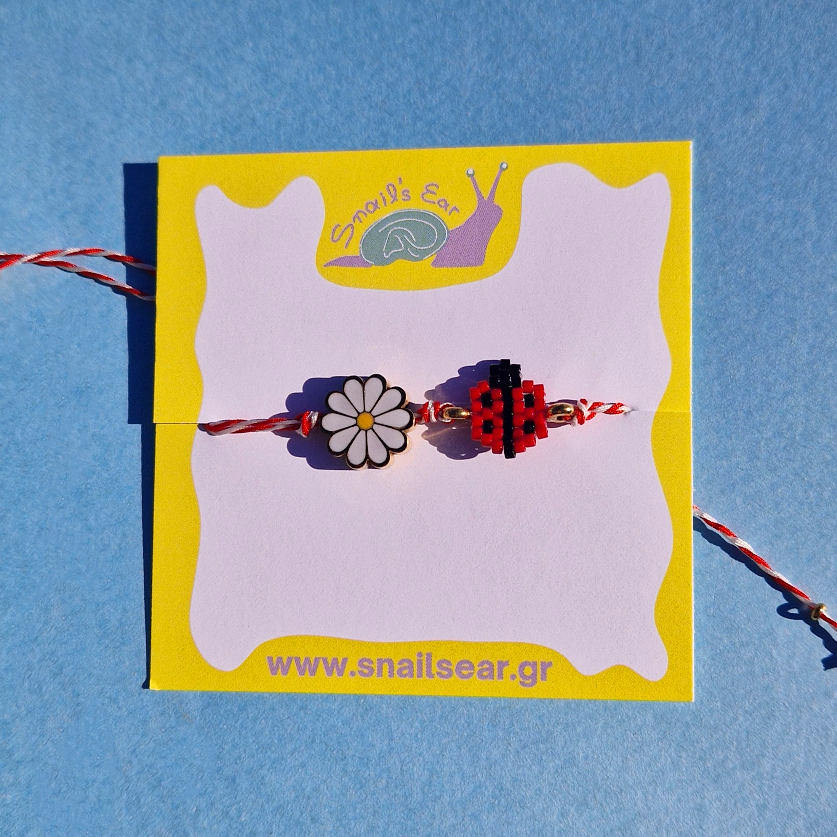 Υποδεχτείτε την άνοιξη με το πιο τυχερό χειροποίητο Μαρτάκι! Με μια πανέμορφη πασχαλίτσα από χάντρες Miyuki και μια ντελικάτη ατσάλινη μαργαρίτα, αυτό το βραχιόλι με μακραμέ δέσιμο είναι το απόλυτο δώρο για ενήλικες και παιδιά. Ένα παραδοσιακό φυλαχτό γεμάτο χρώμα και ευχές, πλασμένο με μεράκι για να σας χαρίσει την πιο γλυκιά ανοιξιάτικη αγκαλιά!