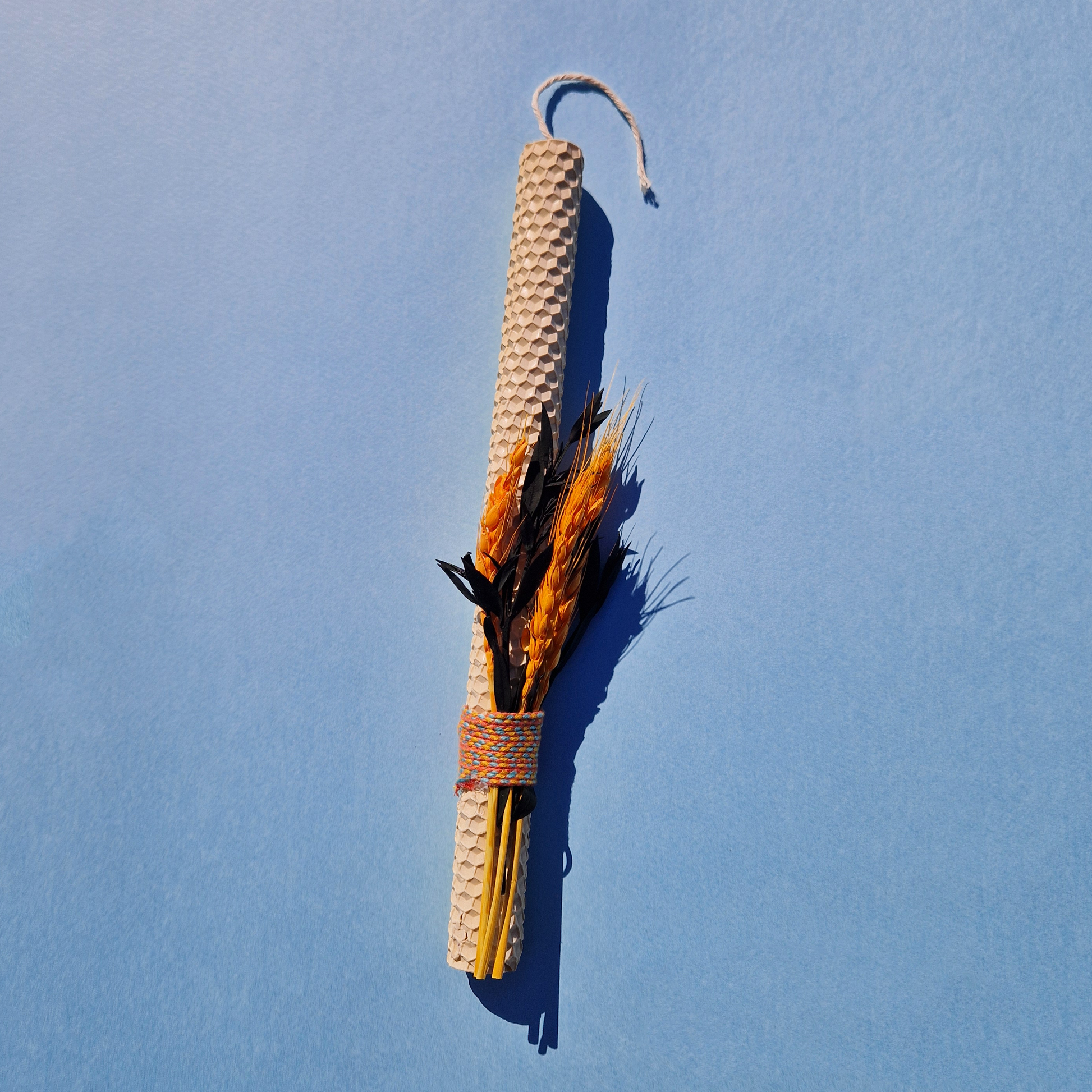 Ανακαλύψτε την χειροποίητη μπεζ λαμπάδα από μελισσοκέρι, διακοσμημένη με αποξηραμένα στάχυα και φύλλα. Φυσική και κομψή, προσφέρει καθαρή καύση και δημιουργεί ατμόσφαιρα ηρεμίας. Ιδανική για το Πάσχα, για να προσθέσετε φυσική ομορφιά στον χώρο σας.