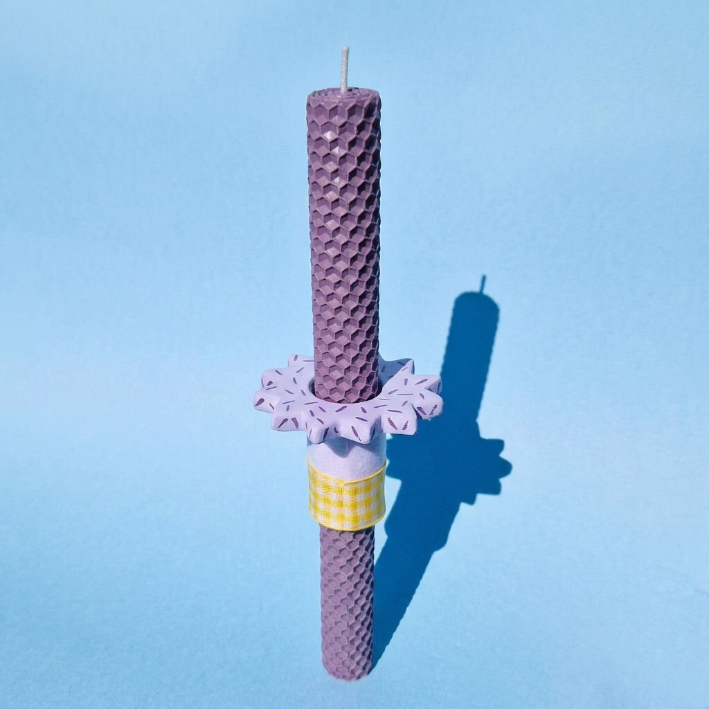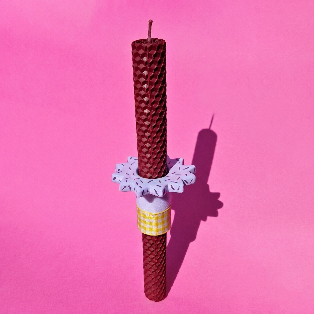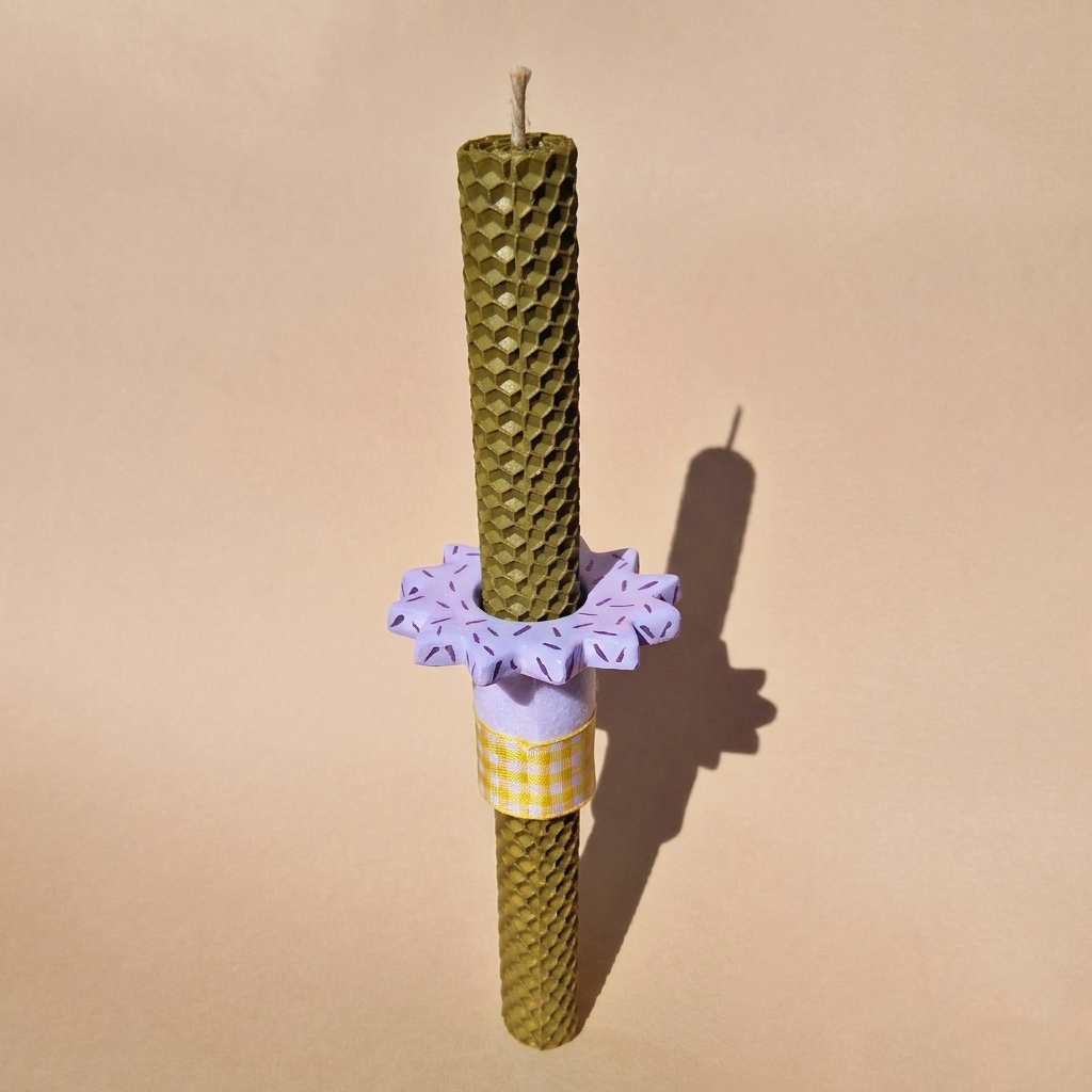 Χαρίστε ένα ξεχωριστό φως φέτος το Πάσχα με τη χειροποίητη λαμπάδα από φυσικό μελισσοκέρι σε δροσερή φυστικί απόχρωση. Το μοναδικό κεραμικό λιλά στοιχείο προσδίδει μια σύγχρονη αισθητική, κάνοντάς την ένα φανταστικό δώρο για το βαφτιστήρι σας. Επιλέγοντας αυτή τη χειροποίητη δημιουργία, προσφέρετε ένα αντικείμενο με ψυχή και το μεθυστικό άρωμα της φύσης, δημιουργώντας αναμνήσεις που θα μείνουν ανεξίτηλες στις καρδιές των αγαπημένων σας!
