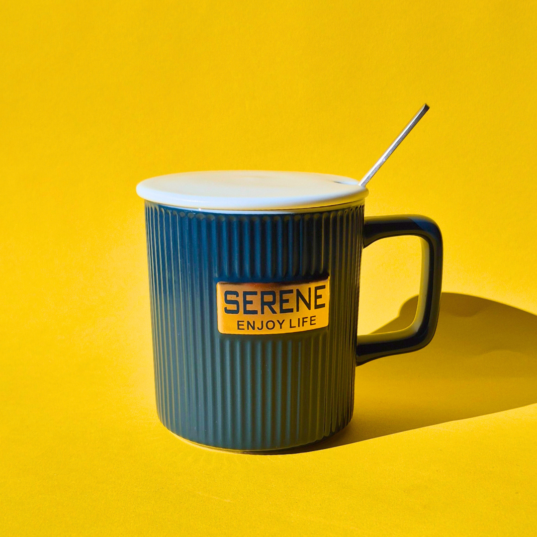 Η Πορσελάνινη Σκούρα Μπλε Κούπα Γκοφρέ με Λευκό Καπάκι, Κουταλάκι και Χρυσό Πλαίσιο που γράφει Serene Enjoy Life αποπνέει ηρεμία και πολυτέλεια. Το σκούρο μπλε χρώμα και οι χρυσές λεπτομέρειες προσφέρουν αίσθηση ηρεμίας και κομψότητας. Ιδανική για καθημερινή χρήση, αυτή η κούπα θα προσφέρει μια ξεχωριστή απόλαυση σε κάθε σας ρόφημα.