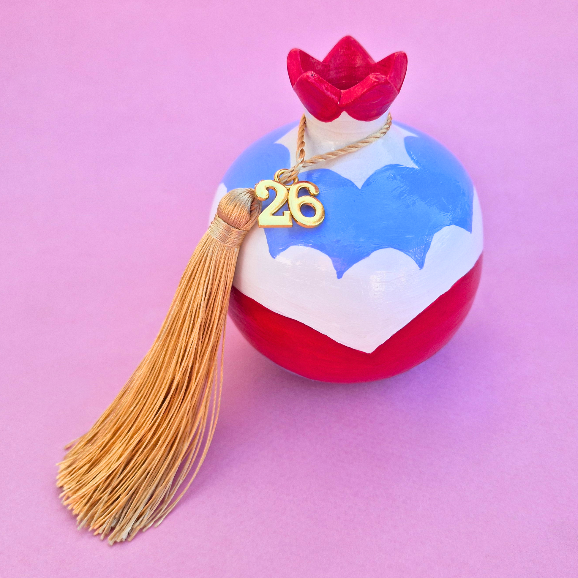 Επιτραπέζιο Χειροποίητο Κεραμικό Χριστουγεννιάτικο Γούρι 2026 Γαλάζιο-Κόκκινο-Λευκό Ρόδι με Φούντα