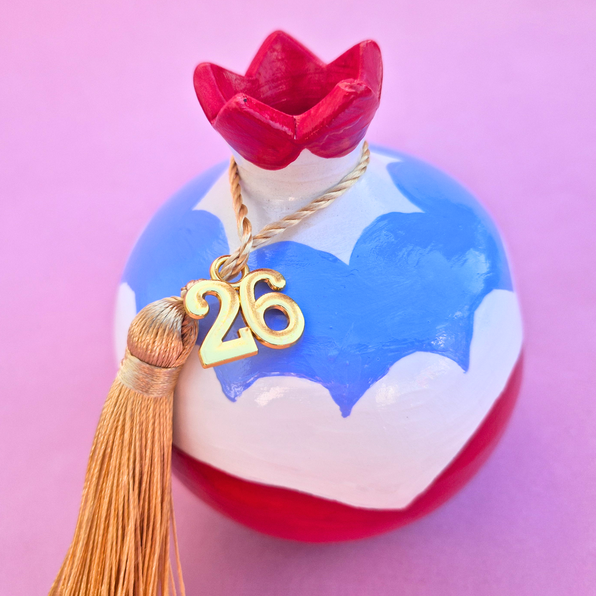 Το Επιτραπέζιο Χειροποίητο Κεραμικό Χριστουγεννιάτικο Γούρι 2026 Γαλάζιο-Κόκκινο-Λευκό Ρόδι με Φούντα είναι ένα μοναδικό, ζωγραφισμένο στο χέρι κεραμικό γούρι, που συνδυάζει αρμονικά χρώματα και θετική ενέργεια. Το ρόδι, σύμβολο τύχης, ευημερίας και νέας αρχής, φέρνει αφθονία στο σπίτι για τη νέα χρονιά. Η χρυσή φούντα και το μεταλλικό στοιχείο “26” ολοκληρώνουν ένα κομψό διακοσμητικό ή ιδανικό δώρο γεμάτο αισιοδοξία και αγάπη.