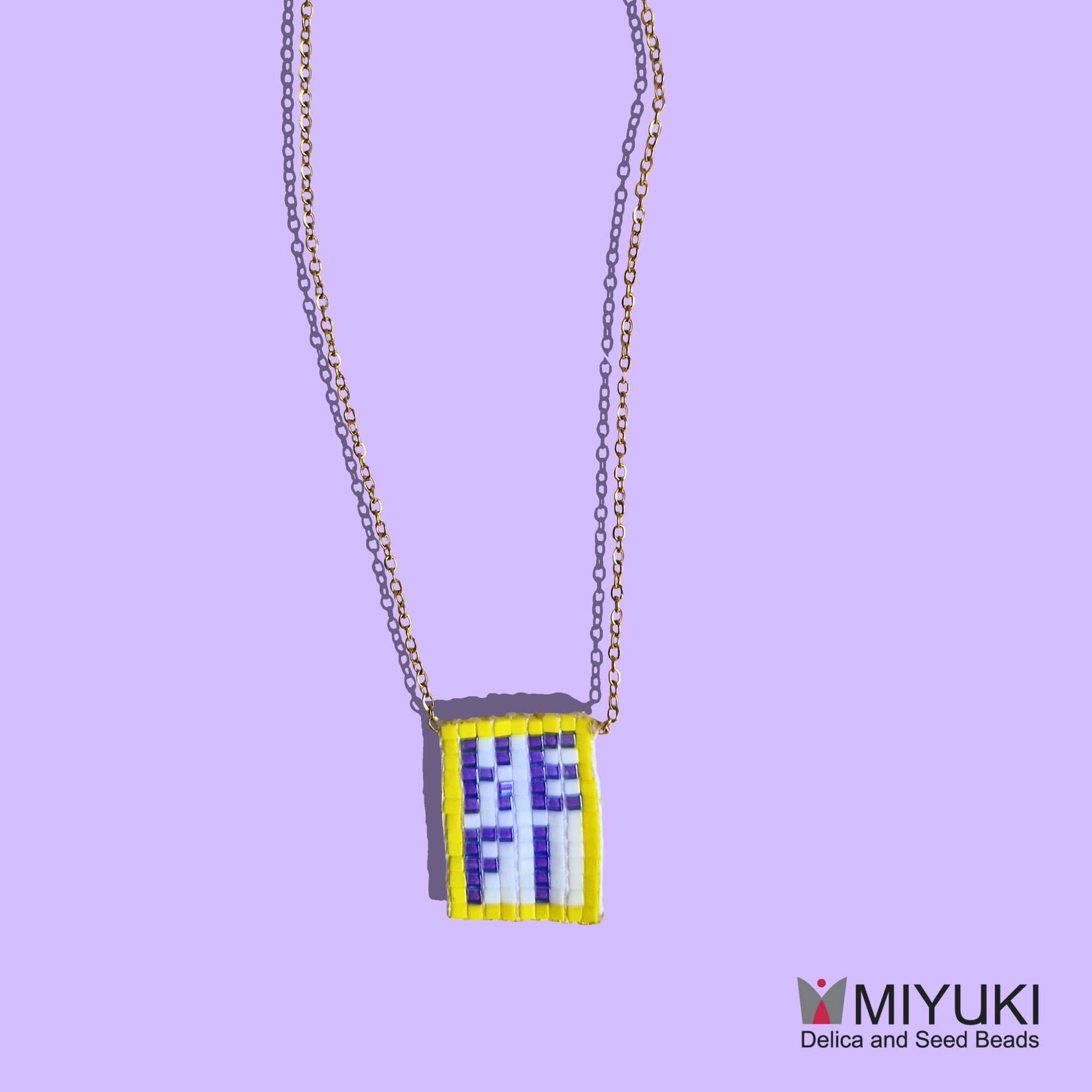 Γέμισε το καλοκαίρι σου κέφι με το χειροποίητο κολιέ "Kefi" από χάντρες MIYUKI σε λευκό τετράγωνο μοτίβο με κίτρινο πλαίσιο και λιλά γράμματα. Η ατσάλινη χρυσή αλυσίδα δεν μαυρίζει και είναι υποαλλεργική. Οι MIYUKI χάντρες προσφέρουν απαράμιλλη ποιότητα, συμμετρία και σταθερό χρώμα για μοναδικό στιλ.