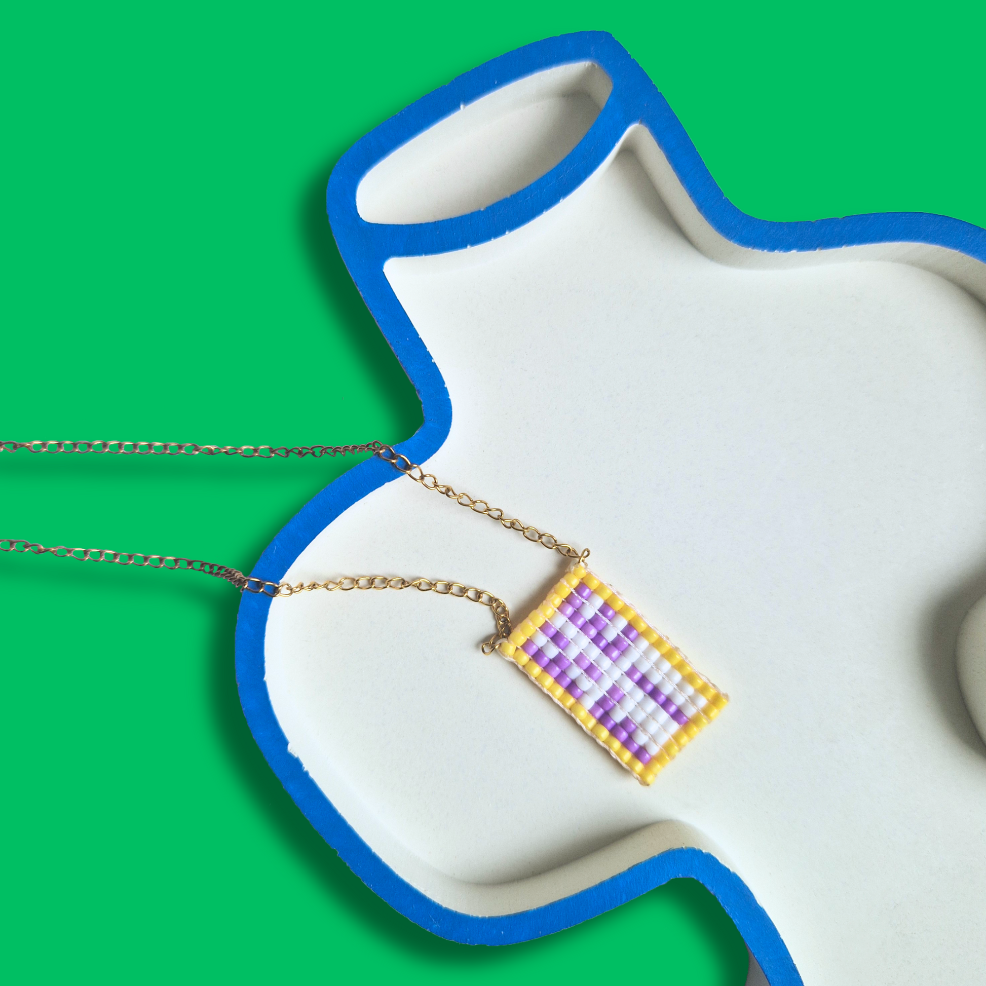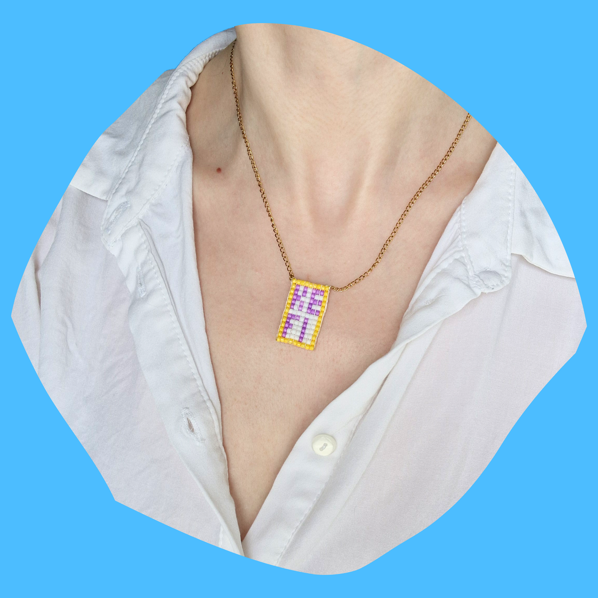 Χειροποίητο κολιέ "Kefi - Κέφι" με χάντρες σε κίτρινο πλαίσιο και λευκό τετράγωνο που γράφει "ΚΕΦΙ" με λιλά γράμματα, σε ατσάλινη χρυσή ή ασημένια αλυσίδα που δεν μαυρίζει ή με πετονιά. Ένα κόσμημα με θετική ενέργεια, κατόπιν παραγγελίας, που εκφράζει το προσωπικό σας στυλ.
