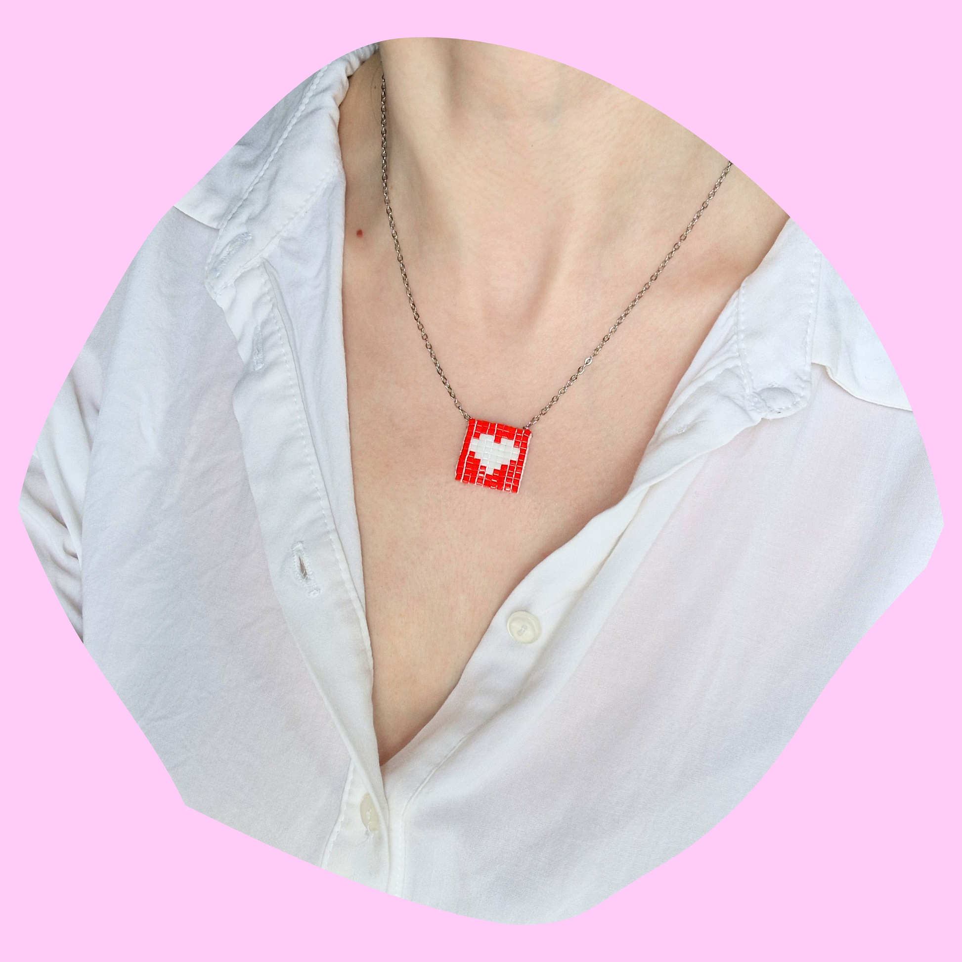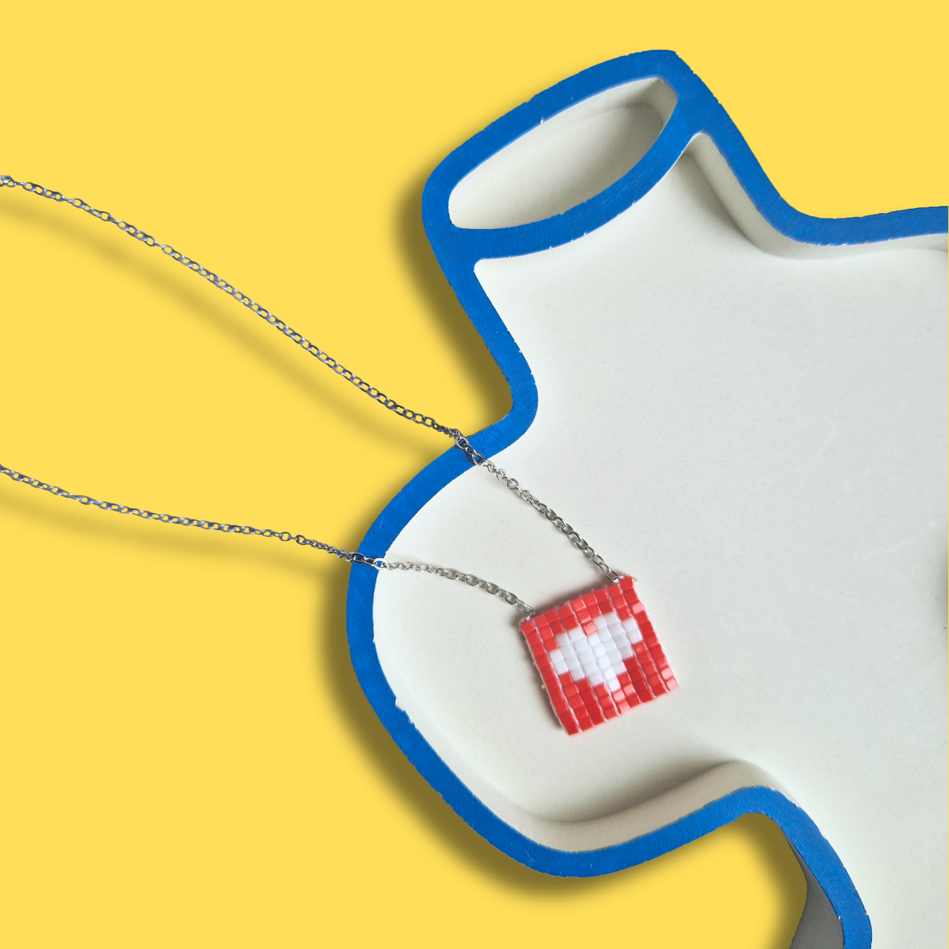 Χειροποίητο κολιέ με λευκή καρδιά από χάντρες Miyuki, μέσα σε κόκκινο τετράγωνο πλαίσιο, σε ατσάλινη ασημένια αλυσίδα που δεν μαυρίζει. Διατίθεται και σε χρυσή αλυσίδα ή πετονιά. Ένα μοναδικό, τρυφερό κόσμημα που φτιάχνεται κατόπιν παραγγελίας – δώρο αγάπης με στυλ και συναίσθημα.